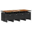 Ta vrtna jedilna garnitura je odlična izbira za večerjo na prostem ali za sprostitev na vrtu, dvorišču ali terasi. Vzdržljiv material: PE ratan, znan tudi kot poli ratan, je močan sintetični material, ki zahteva malo vzdrževanja in je videti kot naravni ratan. Je lahek, enostaven za čiščenje in se zaradi svoje vzdržljivosti in odpornosti na vremenske vplive pogosto uporablja za zunanje pohištvo.Kompaktno shranjevanje: Te stole je mogoče zložiti, zato jih je enostavno shraniti pod mizo. Ko so zloženi, se lepo prilegajo pod mizo in tvorijo prostorsko varčno kocko. Udobno sedenje: To zunanje pohištvo z debelo oblazinjenimi blazinami zagotavlja udobno sedenje.Prevleko je mogoče odstraniti in oprati: Te sedežne blazine imajo odstranljive prevleke za lažje pranje in vzdrževanje.Stabilna mizna plošča, ki je enostavna za čiščenje: Ta vrtna miza ima ploščo iz akacijevega lesa, ki je čvrsta, vzdržljiva in jo je enostavno čistiti z vlažno krpo. Dobro je vedeti: Če želite, da vaše zunanje pohištvo ostane lepo, vam priporočamo, da ga zaščitite z vodoodporno prevleko.Maksimalna nosilnost (na sedež): 110 kg UV-odporno Potrebno sestavljanje: Da Miza: Barva: Črna in rjavaMaterial: PE ratan, prašno premazano jeklo, trden akacijev les z oljnim premazomDimenzije: 220 x 106 x 73 cm (D x Š x V) Stol: Barva: ČrnaMaterial: PE ratan, jeklen okvir s prašnim premazom Dimenzije: 50,5 x 54 x 79 cm (Š x G x V) Velikost sedišča: 45,5 x 38 cm (Š x G) Višina sedišča, merjena od tal: 43 cm Višina naslonjal za roke, merjena od tal: 63,5 cmBlazina: Barva: Kremno bela Material prevleke: Tkanina (100 % poliester) Material polnila: Pena Dimenzije blazine za stol: 76 x 46 x 2 cm (D x Š x D) Paket vsebuje:1 x Vrtna miza 8 x Vrtni stol 8 x Blazina za stol z visokim naslonom s snemljivo in pralno prevleko 3277694