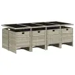 Ta vrtna jedilna garnitura je odlična izbira za večerjo na prostem ali za sprostitev na vrtu, dvorišču ali terasi. Vzdržljiv material: PE ratan, znan tudi kot poli ratan, je močan sintetični material, ki zahteva malo vzdrževanja in je videti kot naravni ratan. Je lahek, enostaven za čiščenje in se zaradi svoje vzdržljivosti in odpornosti na vremenske vplive pogosto uporablja za zunanje pohištvo.Kompaktno shranjevanje: Te stole je mogoče zložiti, zato jih je enostavno shraniti pod mizo. Ko so zloženi, se lepo prilegajo pod mizo in tvorijo prostorsko varčno kocko. Udobno sedenje: To zunanje pohištvo z debelo oblazinjenimi blazinami zagotavlja udobno sedenje.Prevleko je mogoče odstraniti in oprati: Te sedežne blazine imajo odstranljive prevleke za lažje pranje in vzdrževanje.Steklena mizna plošča: Površina zunanje mize je izdelana iz močnega in trpežnega kaljenega stekla, kar omogoča enostavno čiščenje z vlažno krpo in vašemu zunanjemu prostoru doda pridih elegance. Dobro je vedeti: Če želite, da vaše zunanje pohištvo ostane lepo, vam priporočamo, da ga zaščitite z vodoodporno prevleko.Maksimalna nosilnost (na sedež): 110 kg UV-odporno Potrebno sestavljanje: Da Miza: Barva: Svetlo sivaMaterial: PE ratan, jeklo s prašnim premazom, kaljeno stekloDimenzije: 220 x 106 x 73 cm (D x Š x V)Stol: Barva: Svetlo sivaMaterial: PE ratan, jeklen okvir s prašnim premazom Dimenzije: 50,5 x 54 x 79 cm (Š x G x V) Velikost sedišča: 45,5 x 38 cm (Š x G) Višina sedišča, merjena od tal: 43 cm Višina naslonjal za roke, merjena od tal: 63,5 cmBlazina: Barva: Antracitna Material prevleke: Tkanina (100 % poliester) Material polnila: Pena Dimenzije blazine za stol: 76 x 46 x 2 cm (D x Š x D) Paket vsebuje:1 x Vrtna miza 8 x Vrtni stol 8 x Blazina za stol z visokim naslonom s snemljivo in pralno prevleko 3277690