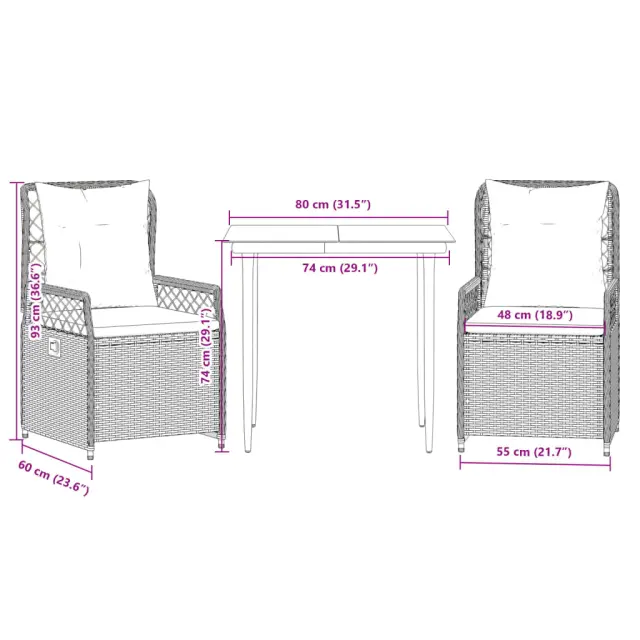 Ta vrtna jedilna garnitura je odlična izbira za večerjo na prostem ali za sprostitev na vrtu, dvorišču ali terasi. Vzdržljiv material: PE ratan, znan tudi kot poli ratan, je močan sintetični material, ki zahteva malo vzdrževanja in je videti kot naravni ratan. Je lahek, enostaven za čiščenje in se zaradi svoje vzdržljivosti in odpornosti na vremenske vplive pogosto uporablja za zunanje pohištvo.Nastavljivo naslonjalo: Ta vrtni sedež ima ročaj. S potegom ročaja lahko naslonjalo nastavite v poljuben položaj in ga hitro vrnete v prvotni položaj.Udobno sedenje: To zunanje pohištvo z debelo oblazinjenimi blazinami zagotavlja udobno sedenje.Prevleko je mogoče odstraniti in oprati: Sedežna blazina ima odstranljivo prevleko za enostavno pranje in vzdrževanje.Steklena mizna plošča: Površina zunanje mize je izdelana iz močnega in trpežnega kaljenega stekla, kar omogoča enostavno čiščenje z vlažno krpo in vašemu zunanjemu prostoru doda pridih elegance. Dobro je vedeti:Če želite, da vaše zunanje pohištvo ostane lepo, vam priporočamo, da ga zaščitite z vodoodporno prevleko.Maksimalna nosilnost (na sedež): 110 kgUV-odpornoPotrebno sestavljanje: DaMiza:Barva: ČrnaMaterial: Jeklo s prašnim premazom, kaljeno stekloDimenzije mize: 80 x 80 x 74 cm (D x Š x V)Vrtni naslanjač:Barva: ČrnaMaterial: PE ratan, jeklen okvir s prašnim premazomDimenzije v sedečem položaju: 55 x 60 x 93 cm (Š x G x V)Dimenzije v ležečem položaju: 55 x 89 x 83 cm (Š x G x V)Velikost sedeža: 48 x 55 cm (Š x G)Višina sedeža, merjena od tal: 42 cmVišina naslonjala za roke, merjena od tal: 58 cmBlazina:Barva: Kremno belaMaterial prevleke: Tkanina (100 % poliester)Polnilo sedežne blazine: PenaPolnilo hrbtne blazine: bombažna vlaknaDimenzije sedežne blazine: 48 x 55 x 3 cm (Š x G x D)Dimenzije hrbtne blazine: 48 x 50 x 10 cm (D x Š x D)Paket vsebuje:1 x Vrtna miza2 x Vrtni stol s funkcijo nagiba2 x Blazina za hrbet2 x Sedežna blazina s snemljivo pralno prevleko 3262957