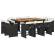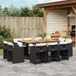 Ta vrtna jedilna garnitura je odlična izbira za večerjo na prostem ali za sprostitev na vrtu, dvorišču ali terasi. Vzdržljiv material: PE ratan, znan tudi kot poli ratan, je močan sintetični material, ki zahteva malo vzdrževanja in je videti kot naravni ratan. Je lahek, enostaven za čiščenje in se zaradi svoje vzdržljivosti in odpornosti na vremenske vplive pogosto uporablja za zunanje pohištvo.Kompaktno shranjevanje: Te stole je mogoče zložiti, zato jih je enostavno shraniti pod mizo. Ko so zloženi, se lepo prilegajo pod mizo in tvorijo prostorsko varčno kocko.Udobno sedenje: To zunanje pohištvo z debelo oblazinjenimi blazinami zagotavlja udobno sedenje.Prevleko je mogoče odstraniti in oprati: Te sedežne blazine imajo odstranljive prevleke za lažje pranje in vzdrževanje. Prevleke za blazine za stole imajo na zadnji strani zavihek za enostavno pritrditev na stole.Stabilna mizna plošča, ki je enostavna za čiščenje: Ta vrtna miza ima ploščo iz akacijevega lesa, ki je čvrsta, vzdržljiva in jo je enostavno čistiti z vlažno krpo. Dobro je vedeti: Če želite, da vaše zunanje pohištvo ostane lepo, vam priporočamo, da ga zaščitite z vodoodporno prevleko.Maksimalna nosilnost (na sedež): 110 kg UV-odporno Potrebno sestavljanje: Da Miza: Barva mize: Črna in rjavaMaterial: PE ratan, jeklo s prašnim premazom, trden akacijev lesDimenzije: 165 x 106 x 73 cm (D x Š x V) Stol: Barva: Črna Material: PE ratan, jeklen okvir s prašnim premazom Dimenzije: 50,5 x 50 x 79 cm (Š x G x V) Velikost sedišča: 45,5 x 38 cm (Š x G) Višina sedišča, merjena od tal: 43 cm Višina naslonjal za roke, merjena od tal: 63,5 cm Blazina: Barva: Kremno bela Material prevleke: Tkanina (100 % poliester) Material polnila: Pena Dimenzije blazine za stol: 76 x 46 x 2 cm (D x Š x D) Paket vsebuje:1 x Vrtna miza 10 x Vrtni stol 10 x Blazina za stol z visokim naslonom s snemljivo in pralno prevleko 3277982