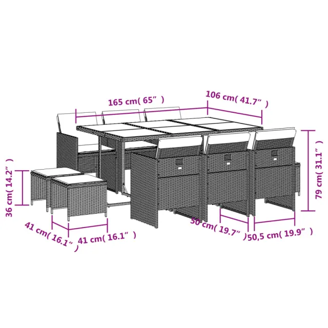 Ta vrtna jedilna garnitura je odlična izbira za večerjo na prostem ali za sprostitev na vrtu, dvorišču ali terasi. Vzdržljiv material: PE ratan, znan tudi kot poli ratan, je močan sintetični material, ki zahteva malo vzdrževanja in je videti kot naravni ratan. Je lahek, enostaven za čiščenje in se zaradi svoje vzdržljivosti in odpornosti na vremenske vplive pogosto uporablja za zunanje pohištvo.Kompaktno shranjevanje: Te stole je mogoče zložiti, zato jih je enostavno shraniti pod mizo. Ko so zloženi, se lepo prilegajo pod mizo in tvorijo prostorsko varčno kocko. Poleg tega je mogoče stolčke shraniti tudi pod stole, kar še poveča prostorsko učinkovitost. Udobno sedenje: To zunanje pohištvo z debelo oblazinjenimi blazinami zagotavlja udobno sedenje.Prevleko je mogoče odstraniti in oprati: Te sedežne blazine imajo odstranljive prevleke za lažje pranje in vzdrževanje.Steklena mizna plošča: Površina zunanje mize je izdelana iz močnega in trpežnega kaljenega stekla, kar omogoča enostavno čiščenje z vlažno krpo in vašemu zunanjemu prostoru doda pridih elegance. Dobro je vedeti: Če želite, da vaše zunanje pohištvo ostane lepo, vam priporočamo, da ga zaščitite z vodoodporno prevleko.Maksimalna nosilnost (na sedež): 110 kg UV-odporno Potrebno sestavljanje: Da Miza: Barva: Mešana bež in črnaMaterial: PE ratan, jeklo s prašnim premazom, kaljeno stekloDimenzije: 165 x 106 x 73 cm (D x Š x V) Stol: Barva: Mešano bežMaterial: PE ratan, jeklen okvir s prašnim premazom Dimenzije: 50,5 x 54 x 79 cm (Š x G x V) Velikost sedišča: 45,5 x 38 cm (Š x G) Višina sedišča, merjena od tal: 43 cm Višina naslonjal za roke, merjena od tal: 63,5 cmStolček: Barva: Mešano bežMaterial: PE ratan, jeklen okvir s prašnim premazom Dimenzije: 41 x 41 x 36 cm (Š x G x V) Blazina: Barva: Svetlo siva Material prevleke: Tkanina (100 % poliester) Material polnila: Pena Dimenzije blazine za stol: 76 x 46 x 2 cm (D x Š x D)Dimenzije blazine za stolček: 40 x 40 x 2 cm (Š x G x D) Paket vsebuje:1 x Vrtna miza 6 x Vrtni stol 4 x Vrtni stolček 4 x Sedežna blazina za stolček s snemljivo in pralno prevleko 6 x Blazina za stol z visokim naslonom s snemljivo in pralno prevleko 3277739