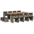 Ta vrtna jedilna garnitura je odlična izbira za večerjo na prostem ali za sprostitev na vrtu, dvorišču ali terasi. Vzdržljiv material: PE ratan, znan tudi kot poli ratan, je močan sintetični material, ki zahteva malo vzdrževanja in je videti kot naravni ratan. Je lahek, enostaven za čiščenje in se zaradi svoje vzdržljivosti in odpornosti na vremenske vplive pogosto uporablja za zunanje pohištvo.Kompaktno shranjevanje: Te stole je mogoče zložiti, zato jih je enostavno shraniti pod mizo. Ko so zloženi, se lepo prilegajo pod mizo in tvorijo prostorsko varčno kocko. Poleg tega je mogoče stolčke shraniti tudi pod stoli, kar še poveča učinkovitost prostora.Udobno sedenje: To zunanje pohištvo z debelo oblazinjenimi blazinami zagotavlja udobno sedenje.Prevleko je mogoče odstraniti in oprati: Te sedežne blazine imajo odstranljive prevleke za lažje pranje in vzdrževanje. Prevleke za blazine za stole imajo na zadnji strani zavihek za enostavno pritrditev na stole.Stabilna mizna plošča, ki je enostavna za čiščenje: Ta vrtna miza ima ploščo iz akacijevega lesa, ki je čvrsta, vzdržljiva in jo je enostavno čistiti z vlažno krpo. Dobro je vedeti: Če želite, da vaše zunanje pohištvo ostane lepo, vam priporočamo, da ga zaščitite z vodoodporno prevleko.Maksimalna nosilnost (na sedež): 110 kg UV-odporno Potrebno sestavljanje: Da Miza: Barva mize: Siva in rjavaMaterial: PE ratan, jeklo s prašnim premazom, trden akacijev lesDimenzije: 220 x 106 x 73 cm (D x Š x V) Stol: Barva: Siva Material: PE ratan, jeklen okvir s prašnim premazom Dimenzije: 50,5 x 50 x 79 cm (Š x G x V) Velikost sedišča: 45,5 x 38 cm (Š x G) Višina sedišča, merjena od tal: 43 cm Višina naslonjal za roke, merjena od tal: 63,5 cm Stolček: Barva: Siva Material: PE ratan, jeklen okvir s prašnim premazom Dimenzije: 41 x 41 x 36 cm (Š x G x V) Blazina: Barva: Temno siva Material prevleke: Tkanina (100 % poliester) Material polnila: Pena Dimenzije blazine za stol: 76 x 46 x 2 cm (D x Š x D)Dimenzije blazine za stolček: 40 x 40 x 2 cm (Š x G x D) Paket vsebuje:1 x Vrtna miza 8 x Vrtni stol 4 x Vrtni stolček 4 x Sedežna blazina za stolček s snemljivo in pralno prevleko 8 x Blazina za stol z visokim naslonom s snemljivo in pralno prevleko 3277933
