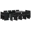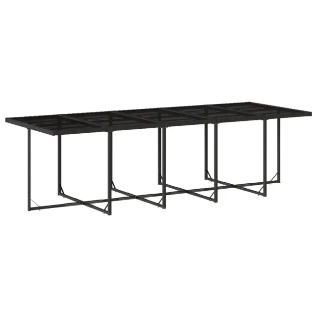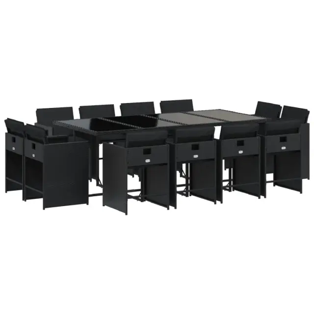 Ta vrtna jedilna garnitura je odlična izbira za večerjo na prostem ali za sprostitev na vrtu, dvorišču ali terasi. Vzdržljiv material: PE ratan, znan tudi kot poli ratan, je močan sintetični material, ki zahteva malo vzdrževanja in je videti kot naravni ratan. Je lahek, enostaven za čiščenje in se zaradi svoje vzdržljivosti in odpornosti na vremenske vplive pogosto uporablja za zunanje pohištvo.Kompaktno shranjevanje: Te stole je mogoče zložiti, zato jih je enostavno shraniti pod mizo. Ko so zloženi, se lepo prilegajo pod mizo in tvorijo prostorsko varčno kocko.Udobno sedenje: To zunanje pohištvo z debelo oblazinjenimi blazinami zagotavlja udobno sedenje.Prevleko je mogoče odstraniti in oprati: Te sedežne blazine imajo odstranljive prevleke za lažje pranje in vzdrževanje. Prevleke za blazine za stole imajo na zadnji strani zavihek za enostavno pritrditev na stole.Stabilna in enostavna za čiščenje namizna plošča: Ta vrtna miza ima mizno ploščo iz kaljenega stekla, ki je stabilna, vzdržljiva in jo je enostavno očistiti z vlažno krpo. Dobro je vedeti: Če želite, da vaše zunanje pohištvo ostane lepo, vam priporočamo, da ga zaščitite z vodoodporno prevleko.Maksimalna nosilnost (na sedež): 110 kg UV-odporno Potrebno sestavljanje: Da Miza: Barva mizice: ČrnaBarva stekla: ČrnaMaterial: PE ratan, jeklo s prašnim premazom, kaljeno stekloDimenzije: 220 x 106 x 73 cm (D x Š x V) Stol: Barva: Črna Material: PE ratan, jeklen okvir s prašnim premazom Dimenzije: 50,5 x 50 x 79 cm (Š x G x V) Velikost sedišča: 45,5 x 38 cm (Š x G) Višina sedišča, merjena od tal: 43 cm Višina naslonjal za roke, merjena od tal: 63,5 cm Blazina: Barva: Črna Material prevleke: Tkanina (100 % poliester) Material polnila: Pena Dimenzije blazine za stol: 76 x 46 x 2 cm (D x Š x D) Paket vsebuje:1 x Vrtna miza 12 x Vrtni stol 12 x Blazina za stol z visokim naslonom s snemljivo in pralno prevleko 3277986