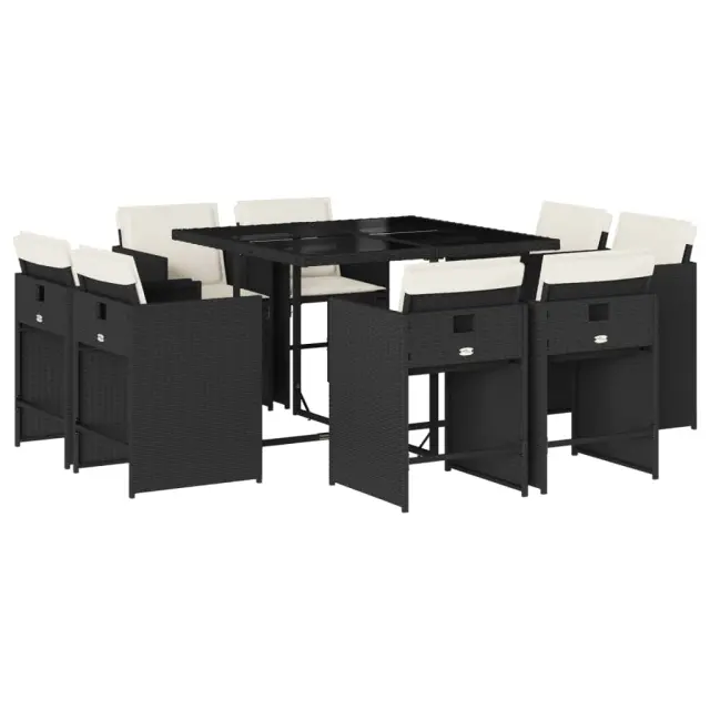 Ta vrtna jedilna garnitura je odlična izbira za večerjo na prostem ali za sprostitev na vrtu, dvorišču ali terasi. Vzdržljiv material: PE ratan, znan tudi kot poli ratan, je močan sintetični material, ki zahteva malo vzdrževanja in je videti kot naravni ratan. Je lahek, enostaven za čiščenje in se zaradi svoje vzdržljivosti in odpornosti na vremenske vplive pogosto uporablja za zunanje pohištvo.Kompaktno shranjevanje: Te stole je mogoče zložiti, zato jih je enostavno shraniti pod mizo. Ko so zloženi, se lepo prilegajo pod mizo in tvorijo prostorsko varčno kocko.Udobno sedenje: To zunanje pohištvo z debelo oblazinjenimi blazinami zagotavlja udobno sedenje.Prevleko je mogoče odstraniti in oprati: Te sedežne blazine imajo odstranljive prevleke za lažje pranje in vzdrževanje. Prevleke za blazine za stole imajo na zadnji strani zavihek za enostavno pritrditev na stole.Stabilna in enostavna za čiščenje namizna plošča: Ta vrtna miza ima mizno ploščo iz kaljenega stekla, ki je stabilna, vzdržljiva in jo je enostavno očistiti z vlažno krpo. Dobro je vedeti: Če želite, da vaše zunanje pohištvo ostane lepo, vam priporočamo, da ga zaščitite z vodoodporno prevleko.Maksimalna nosilnost (na sedež): 110 kg UV-odporno Potrebno sestavljanje: Da Miza: Barva mizice: ČrnaBarva stekla: ČrnaMaterial: PE ratan, jeklo s prašnim premazom, kaljeno stekloDimenzije: 110 x 106 x 73 cm (D x Š x V) Stol: Barva: Črna Material: PE ratan, jeklen okvir s prašnim premazom Dimenzije: 50,5 x 50 x 79 cm (Š x G x V) Velikost sedišča: 45,5 x 38 cm (Š x G) Višina sedišča, merjena od tal: 43 cm Višina naslonjal za roke, merjena od tal: 63,5 cm Blazina: Barva: Kremno bela Material prevleke: Tkanina (100 % poliester) Material polnila: Pena Dimenzije blazine za stol: 76 x 46 x 2 cm (D x Š x D) Paket vsebuje:1 x Vrtna miza 8 x Vrtni stol 8 x Blazina za stol z visokim naslonom s snemljivo in pralno prevleko 3277961