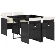 Ta vrtna jedilna garnitura je odlična izbira za večerjo na prostem ali za sprostitev na vrtu, dvorišču ali terasi. Vzdržljiv material: PE ratan, znan tudi kot poli ratan, je močan sintetični material, ki zahteva malo vzdrževanja in je videti kot naravni ratan. Je lahek, enostaven za čiščenje in se zaradi svoje vzdržljivosti in odpornosti na vremenske vplive pogosto uporablja za zunanje pohištvo.Kompaktno shranjevanje: Te stole je mogoče zložiti, zato jih je enostavno shraniti pod mizo. Ko so zloženi, se lepo prilegajo pod mizo in tvorijo prostorsko varčno kocko. Udobno sedenje: To zunanje pohištvo z debelo oblazinjenimi blazinami zagotavlja udobno sedenje.Prevleko je mogoče odstraniti in oprati: Te sedežne blazine imajo odstranljive prevleke za lažje pranje in vzdrževanje.Steklena mizna plošča: Površina zunanje mize je izdelana iz močnega in trpežnega kaljenega stekla, kar omogoča enostavno čiščenje z vlažno krpo in vašemu zunanjemu prostoru doda pridih elegance. Dobro je vedeti: Če želite, da vaše zunanje pohištvo ostane lepo, vam priporočamo, da ga zaščitite z vodoodporno prevleko.Maksimalna nosilnost (na sedež): 110 kg UV-odporno Potrebno sestavljanje: Da Miza: Barva: ČrnaMaterial: PE ratan, jeklo s prašnim premazom, kaljeno stekloDimenzije: 110 x 106 x 73 cm (D x Š x V) Stol: Barva: ČrnaMaterial: PE ratan, jeklen okvir s prašnim premazom Dimenzije: 50,5 x 54 x 79 cm (Š x G x V) Velikost sedišča: 45,5 x 38 cm (Š x G) Višina sedišča, merjena od tal: 43 cm Višina naslonjal za roke, merjena od tal: 63,5 cmBlazina: Barva: Kremno bela Material prevleke: Tkanina (100 % poliester) Material polnila: Pena Dimenzije blazine za stol: 76 x 46 x 2 cm (D x Š x D)Paket vsebuje:1 x Vrtna miza 4 x Vrtni stol4 x Blazina za stol z visokim naslonom s snemljivo in pralno prevleko 3277661