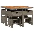 Ta vrtna jedilna garnitura je odlična izbira za večerjo na prostem ali za sprostitev na vrtu, dvorišču ali terasi. Vzdržljiv material: PE ratan, znan tudi kot poli ratan, je močan sintetični material, ki zahteva malo vzdrževanja in je videti kot naravni ratan. Je lahek, enostaven za čiščenje in se zaradi svoje vzdržljivosti in odpornosti na vremenske vplive pogosto uporablja za zunanje pohištvo.Kompaktno shranjevanje: Te stole je mogoče zložiti, zato jih je enostavno shraniti pod mizo. Ko so zloženi, se lepo prilegajo pod mizo in tvorijo prostorsko varčno kocko. Poleg tega je mogoče stolčke shraniti tudi pod stole, kar še poveča prostorsko učinkovitost.Udobno sedenje: To zunanje pohištvo z debelo oblazinjenimi blazinami zagotavlja udobno sedenje.Prevleko je mogoče odstraniti in oprati: Te sedežne blazine imajo odstranljive prevleke za lažje pranje in vzdrževanje. Prevleke za blazine imajo na zadnji strani zavihek za enostavno pritrditev na naslonjala.Stabilna mizna plošča, ki je enostavna za čiščenje: Ta vrtna miza ima ploščo iz akacijevega lesa, ki je čvrsta, vzdržljiva in jo je enostavno čistiti z vlažno krpo. Dobro je vedeti: Če želite, da vaše zunanje pohištvo ostane lepo, vam priporočamo, da ga zaščitite z vodoodporno prevleko.Maksimalna nosilnost (na sedež): 110 kg UV-odporno Potrebno sestavljanje: Da Miza: Barva mize: Siva in rjavaMaterial: PE ratan, jeklo s prašnim premazom, trden akacijev lesDimenzije: 110 x 106 x 73 cm (D x Š x V) Stol: Barva: Siva Material: PE ratan, jeklen okvir s prašnim premazom Dimenzije: 50,5 x 50 x 79 cm (Š x G x V) Velikost sedišča: 45,5 x 38 cm (Š x G) Višina sedišča, merjena od tal: 43 cm Višina naslonjal za roke, merjena od tal: 63,5 cm Stolček: Barva: Siva Material: PE ratan, jeklen okvir s prašnim premazom Dimenzije: 41 x 41 x 36 cm (Š x G x V) Blazina: Barva: Temno siva Material prevleke: Tkanina (100 % poliester) Material polnila: Pena Dimenzije blazine za stol: 76 x 46 x 2 cm (D x Š x D)Dimenzije blazine za stolček: 40 x 40 x 2 cm (Š x G x D) Paket vsebuje:1 x Vrtna miza 4 x Vrtni stol 4 x Vrtni stolček 4 x Sedežna blazina za stolček s snemljivo in pralno prevleko 4 x Blazina za stol z visokim naslonom s snemljivo in pralno prevleko 3278089