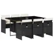 Ta vrtna jedilna garnitura je odlična izbira za večerjo na prostem ali za sprostitev na vrtu, dvorišču ali terasi. Vzdržljiv material: PE ratan, znan tudi kot poli ratan, je močan sintetični material, ki zahteva malo vzdrževanja in je videti kot naravni ratan. Je lahek, enostaven za čiščenje in se zaradi svoje vzdržljivosti in odpornosti na vremenske vplive pogosto uporablja za zunanje pohištvo.Kompaktno shranjevanje: Te stole je mogoče zložiti, zato jih je enostavno shraniti pod mizo. Ko so zloženi, se lepo prilegajo pod mizo in tvorijo prostorsko varčno kocko. Udobno sedenje: To zunanje pohištvo z debelo oblazinjenimi blazinami zagotavlja udobno sedenje.Prevleko je mogoče odstraniti in oprati: Te sedežne blazine imajo odstranljive prevleke za lažje pranje in vzdrževanje.Steklena mizna plošča: Površina zunanje mize je izdelana iz močnega in trpežnega kaljenega stekla, kar omogoča enostavno čiščenje z vlažno krpo in vašemu zunanjemu prostoru doda pridih elegance. Dobro je vedeti: Če želite, da vaše zunanje pohištvo ostane lepo, vam priporočamo, da ga zaščitite z vodoodporno prevleko.Maksimalna nosilnost (na sedež): 110 kg UV-odporno Potrebno sestavljanje: Da Miza: Barva: ČrnaMaterial: PE ratan, jeklo s prašnim premazom, kaljeno stekloDimenzije: 165 x 106 x 73 cm (D x Š x V)Stol: Barva: ČrnaMaterial: PE ratan, jeklen okvir s prašnim premazom Dimenzije: 50,5 x 54 x 79 cm (Š x G x V) Velikost sedišča: 45,5 x 38 cm (Š x G) Višina sedišča, merjena od tal: 43 cm Višina naslonjal za roke, merjena od tal: 63,5 cmBlazina: Barva: Kremno bela Material prevleke: Tkanina (100 % poliester) Material polnila: Pena Dimenzije blazine za stol: 76 x 46 x 2 cm (D x Š x D) Paket vsebuje:1 x Vrtna miza 6 x Vrtni stol6 x Blazina za stol z visokim naslonom s snemljivo in pralno prevleko 3277673
