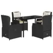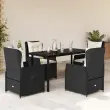 Ta vrtna jedilna garnitura je odlična izbira za večerjo na prostem ali za sprostitev na vrtu, dvorišču ali terasi. Vzdržljiv material: PE ratan, znan tudi kot poli ratan, je močan sintetični material, ki zahteva malo vzdrževanja in je videti kot naravni ratan. Je lahek, enostaven za čiščenje in se zaradi svoje vzdržljivosti in odpornosti na vremenske vplive pogosto uporablja za zunanje pohištvo.Nastavljivo naslonjalo: Ta vrtni sedež ima ročaj. S potegom ročaja lahko naslonjalo nastavite v poljuben položaj in ga hitro vrnete v prvotni položaj.Udobno sedenje: To zunanje pohištvo z debelo oblazinjenimi blazinami zagotavlja udobno sedenje.Prevleko je mogoče odstraniti in oprati: Sedežna blazina ima odstranljivo prevleko za enostavno pranje in vzdrževanje.Steklena mizna plošča: Površina zunanje mize je izdelana iz močnega in trpežnega kaljenega stekla, kar omogoča enostavno čiščenje z vlažno krpo in vašemu zunanjemu prostoru doda pridih elegance. Dobro je vedeti:Če želite, da vaše zunanje pohištvo ostane lepo, vam priporočamo, da ga zaščitite z vodoodporno prevleko.Maksimalna nosilnost (na sedež): 110 kgUV-odpornoPotrebno sestavljanje: DaMiza:Barva: ČrnaMaterial: Jeklo s prašnim premazom, kaljeno stekloDimenzije: 140 x 70 x 74 cm (D x Š x V)Vrtni naslanjač:Barva: ČrnaMaterial: PE ratan, jeklen okvir s prašnim premazomDimenzije v sedečem položaju: 55 x 60 x 93 cm (Š x G x V)Dimenzije v ležečem položaju: 55 x 89 x 83 cm (Š x G x V)Velikost sedeža: 48 x 55 cm (Š x G)Višina sedeža, merjena od tal: 42 cmVišina naslonjala za roke, merjena od tal: 58 cmBlazina:Barva: Kremno belaMaterial prevleke: Tkanina (100 % poliester)Polnilo sedežne blazine: PenaPolnilo hrbtne blazine: bombažna vlaknaDimenzije sedežne blazine: 48 x 55 x 3 cm (Š x G x D)Dimenzije hrbtne blazine: 48 x 50 x 10 cm (D x Š x D)Paket vsebuje:1 x Vrtna miza4 x Vrtni stol s funkcijo nagiba4 x Blazina za hrbet4 x Sedežna blazina s snemljivo in pralno prevleko 3262835