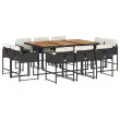 Ta vrtna jedilna garnitura je odlična izbira za večerjo na prostem ali za sprostitev na vrtu, dvorišču ali terasi. Vzdržljiv material: PE ratan, znan tudi kot poli ratan, je močan sintetični material, ki zahteva malo vzdrževanja in je videti kot naravni ratan. Je lahek, enostaven za čiščenje in se zaradi svoje vzdržljivosti in odpornosti na vremenske vplive pogosto uporablja za zunanje pohištvo.Kompaktno shranjevanje: Te stole je mogoče zložiti, zato jih je enostavno shraniti pod mizo. Ko so zloženi, se lepo prilegajo pod mizo in tvorijo prostorsko varčno kocko.Udobno sedenje: To zunanje pohištvo z debelo oblazinjenimi blazinami zagotavlja udobno sedenje.Prevleko je mogoče odstraniti in oprati: Te sedežne blazine imajo odstranljive prevleke za lažje pranje in vzdrževanje. Prevleke za blazine za stole imajo na zadnji strani zavihek za enostavno pritrditev na stole.Stabilna mizna plošča, ki je enostavna za čiščenje: Ta miza za teraso ima površino iz akacijevega lesa, ki je čvrsta, vzdržljiva in jo je enostavno čistiti z vlažno krpo. Dobro je vedeti:Če želite, da vaše zunanje pohištvo ostane lepo, vam priporočamo, da ga zaščitite z vodoodporno prevleko.Maksimalna nosilnost (na sedež): 110 kgUV-odpornoPotrebno sestavljanje: DaVrtna miza:Barva: ČrnaMaterial: PE ratan, prašno premazano jeklo, trden akacijev les z oljnim premazomDimenzije: 165 x 106 x 73 cm (D x Š x V)Vrtni stol:Barva: ČrnaMaterial: PE ratan, jeklen okvir s prašnim premazomDimenzije: 50,5 x 54 x 79 cm (Š x G x V)Velikost sedišča: 45,5 x 38 cm (Š x G)Višina sedišča, merjena od tal: 43 cmVišina naslonjal za roke, merjena od tal: 63,5 cmBlazina:Barva: Kremno bela Material prevleke: Tkanina (100 % poliester)Material polnila: PenaDimenzije: 76 x 46 x 2 cm (Š x G x D)Paket vsebuje:1 x Vrtna miza10 x Vrtni stol10 x Blazina za stol z visokim naslonom s snemljivo in pralno prevleko 3278162