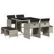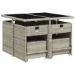 Ta vrtna jedilna garnitura je odlična izbira za večerjo na prostem ali za sprostitev na vrtu, dvorišču ali terasi. Vzdržljiv material: PE ratan, znan tudi kot poli ratan, je močan sintetični material, ki zahteva malo vzdrževanja in je videti kot naravni ratan. Je lahek, enostaven za čiščenje in se zaradi svoje vzdržljivosti in odpornosti na vremenske vplive pogosto uporablja za zunanje pohištvo.Kompaktno shranjevanje: Te stole je mogoče zložiti, zato jih je enostavno shraniti pod mizo. Ko so zloženi, se lepo prilegajo pod mizo in tvorijo prostorsko varčno kocko. Poleg tega je mogoče stolčke shraniti tudi pod stoli, kar še poveča učinkovitost prostora.Udobno sedenje: To zunanje pohištvo z debelo oblazinjenimi blazinami zagotavlja udobno sedenje.Prevleko je mogoče odstraniti in oprati: Te sedežne blazine imajo odstranljive prevleke za lažje pranje in vzdrževanje. Prevleke za blazine za stole imajo na zadnji strani zavihek za enostavno pritrditev na stole.Stabilna in enostavna za čiščenje namizna plošča: Ta vrtna miza ima mizno ploščo iz kaljenega stekla, ki je stabilna, vzdržljiva in jo je enostavno očistiti z vlažno krpo. Dobro je vedeti: Če želite, da vaše zunanje pohištvo ostane lepo, vam priporočamo, da ga zaščitite z vodoodporno prevleko.Maksimalna nosilnost (na sedež): 110 kg UV-odporno Potrebno sestavljanje: Da Miza: Barva mize: Svetlo sivaBarva stekla: ČrnaMaterial: PE ratan, jeklo s prašnim premazom, kaljeno stekloDimenzije: 110 x 106 x 73 cm (D x Š x V) Stol: Barva: Svetlo siva Material: PE ratan, jeklen okvir s prašnim premazom Dimenzije: 50,5 x 50 x 79 cm (Š x G x V) Velikost sedišča: 45,5 x 38 cm (Š x G) Višina sedišča, merjena od tal: 43 cm Višina naslonjal za roke, merjena od tal: 63,5 cm Stolček: Barva: Svetlo siva Material: PE ratan, jeklen okvir s prašnim premazom Dimenzije: 41 x 41 x 36 cm (Š x G x V) Blazina: Barva: Antracitna Material prevleke: Tkanina (100 % poliester) Material polnila: Pena Dimenzije blazine za stol: 76 x 46 x 2 cm (D x Š x D)Dimenzije blazine za stolček: 40 x 40 x 2 cm (Š x G x D) Paket vsebuje:1 x Vrtna miza 4 x Vrtni stol 4 x Vrtni stolček 4 x Sedežna blazina za stolček s snemljivo in pralno prevleko 4 x Blazina za stol z visokim naslonom s snemljivo in pralno prevleko 3277906