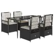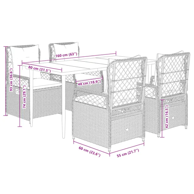 Ta vrtna jedilna garnitura je odlična izbira za večerjo na prostem ali za sprostitev na vrtu, dvorišču ali terasi. Vzdržljiv material: PE ratan, znan tudi kot poli ratan, je močan sintetični material, ki zahteva malo vzdrževanja in je videti kot naravni ratan. Je lahek, enostaven za čiščenje in se zaradi svoje vzdržljivosti in odpornosti na vremenske vplive pogosto uporablja za zunanje pohištvo.Nastavljivo naslonjalo: Ta vrtni sedež ima ročaj. S potegom ročaja lahko naslonjalo nastavite v poljuben položaj in ga hitro vrnete v prvotni položaj.Udobno sedenje: To zunanje pohištvo z debelo oblazinjenimi blazinami zagotavlja udobno sedenje.Prevleko je mogoče odstraniti in oprati: Sedežna blazina ima odstranljivo prevleko za enostavno pranje in vzdrževanje.Steklena mizna plošča: Površina zunanje mize je izdelana iz močnega in trpežnega kaljenega stekla, kar omogoča enostavno čiščenje z vlažno krpo in vašemu zunanjemu prostoru doda pridih elegance. Dobro je vedeti:Če želite, da vaše zunanje pohištvo ostane lepo, vam priporočamo, da ga zaščitite z vodoodporno prevleko.Maksimalna nosilnost (na sedež): 110 kgUV-odpornoPotrebno sestavljanje: DaMiza:Barva: ČrnaMaterial: Jeklo s prašnim premazom, kaljeno stekloDimenzije mize: 160 x 80 x 74 cm (D x Š x V)Vrtni naslanjač:Barva: ČrnaMaterial: PE ratan, jeklen okvir s prašnim premazomDimenzije v sedečem položaju: 55 x 60 x 93 cm (Š x G x V)Dimenzije v ležečem položaju: 55 x 89 x 83 cm (Š x G x V)Velikost sedeža: 48 x 55 cm (Š x G)Višina sedeža, merjena od tal: 42 cmVišina naslonjala za roke, merjena od tal: 58 cmBlazina:Barva: Kremno belaMaterial prevleke: Tkanina (100 % poliester)Polnilo sedežne blazine: PenaPolnilo hrbtne blazine: bombažna vlaknaDimenzije sedežne blazine: 48 x 55 x 3 cm (Š x G x D)Dimenzije hrbtne blazine: 48 x 50 x 10 cm (D x Š x D)Paket vsebuje:1 x Vrtna miza4 x Vrtni stol s funkcijo nagiba4 x Blazina za hrbet4 x Sedežna blazina s snemljivo in pralno prevleko 3262960