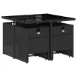 Ta vrtna jedilna garnitura je odlična izbira za večerjo na prostem ali za sprostitev na vrtu, dvorišču ali terasi. Vzdržljiv material: PE ratan, znan tudi kot poli ratan, je močan sintetični material, ki zahteva malo vzdrževanja in je videti kot naravni ratan. Je lahek, enostaven za čiščenje in se zaradi svoje vzdržljivosti in odpornosti na vremenske vplive pogosto uporablja za zunanje pohištvo.Kompaktno shranjevanje: Te stole je mogoče zložiti, zato jih je enostavno shraniti pod mizo. Ko so zloženi, se lepo prilegajo pod mizo in tvorijo prostorsko varčno kocko. Poleg tega je mogoče stolčke shraniti tudi pod stole, kar še poveča prostorsko učinkovitost. Udobno sedenje: To zunanje pohištvo z debelo oblazinjenimi blazinami zagotavlja udobno sedenje.Prevleko je mogoče odstraniti in oprati: Te sedežne blazine imajo odstranljive prevleke za lažje pranje in vzdrževanje.Steklena mizna plošča: Površina zunanje mize je izdelana iz močnega in trpežnega kaljenega stekla, kar omogoča enostavno čiščenje z vlažno krpo in vašemu zunanjemu prostoru doda pridih elegance. Dobro je vedeti: Če želite, da vaše zunanje pohištvo ostane lepo, vam priporočamo, da ga zaščitite z vodoodporno prevleko.Maksimalna nosilnost (na sedež): 110 kg UV-odporno Potrebno sestavljanje: Da Miza: Barva: ČrnaMaterial: PE ratan, jeklo s prašnim premazom, kaljeno stekloDimenzije: 110 x 106 x 73 cm (D x Š x V)Stol: Barva: ČrnaMaterial: PE ratan, jeklen okvir s prašnim premazom Dimenzije: 50,5 x 54 x 79 cm (Š x G x V) Velikost sedišča: 45,5 x 38 cm (Š x G) Višina sedišča, merjena od tal: 43 cm Višina naslonjal za roke, merjena od tal: 63,5 cm Stolček: Barva: ČrnaMaterial: PE ratan, jeklen okvir s prašnim premazom Dimenzije: 41 x 41 x 36 cm (Š x G x V) Blazina: Barva: Črna Material prevleke: Tkanina (100 % poliester) Material polnila: Pena Dimenzije blazine za stol: 76 x 46 x 2 cm (D x Š x D)Dimenzije blazine za stolček: 40 x 40 x 2 cm (Š x G x D) Paket vsebuje:1 x Vrtna miza 4 x Vrtni stol 4 x Vrtni stolček 4 x Sedežna blazina za stolček s snemljivo in pralno prevleko 4 x Blazina za stol z visokim naslonom s snemljivo in pralno prevleko 3277722