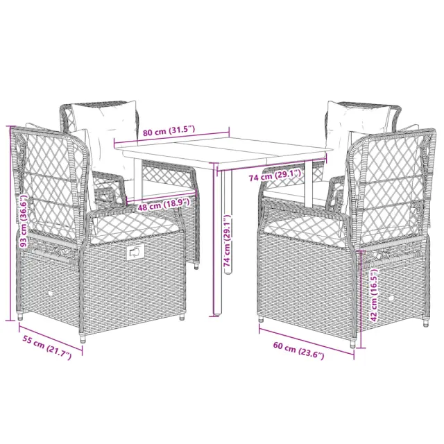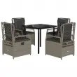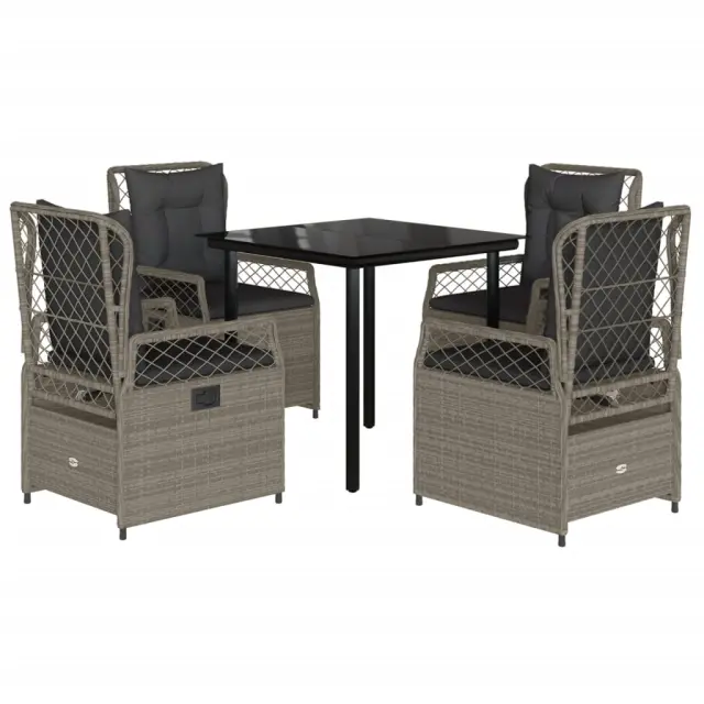 Ta vrtna jedilna garnitura je odlična izbira za večerjo na prostem ali za sprostitev na vrtu, dvorišču ali terasi. Vzdržljiv material: PE ratan, znan tudi kot poli ratan, je močan sintetični material, ki zahteva malo vzdrževanja in je videti kot naravni ratan. Je lahek, enostaven za čiščenje in se zaradi svoje vzdržljivosti in odpornosti na vremenske vplive pogosto uporablja za zunanje pohištvo.Nastavljivo naslonjalo: Ta vrtni sedež ima ročaj. S potegom ročaja lahko naslonjalo nastavite v poljuben položaj in ga hitro vrnete v prvotni položaj.Udobno sedenje: To zunanje pohištvo z debelo oblazinjenimi blazinami zagotavlja udobno sedenje.Prevleko je mogoče odstraniti in oprati: Sedežna blazina ima odstranljivo prevleko za enostavno pranje in vzdrževanje.Steklena mizna plošča: Površina zunanje mize je izdelana iz močnega in trpežnega kaljenega stekla, kar omogoča enostavno čiščenje z vlažno krpo in vašemu zunanjemu prostoru doda pridih elegance. Dobro je vedeti:Če želite, da vaše zunanje pohištvo ostane lepo, vam priporočamo, da ga zaščitite z vodoodporno prevleko.Maksimalna nosilnost (na sedež): 110 kgUV-odpornoPotrebno sestavljanje: DaMiza:Barva: ČrnaMaterial: Jeklo s prašnim premazom, kaljeno stekloDimenzije mize: 80 x 80 x 74 cm (D x Š x V)Vrtni naslanjač:Barva: Svetlo sivaMaterial: PE ratan, jeklen okvir s prašnim premazomDimenzije v sedečem položaju: 55 x 60 x 93 cm (Š x G x V)Dimenzije v ležečem položaju: 55 x 89 x 83 cm (Š x G x V)Velikost sedeža: 48 x 55 cm (Š x G)Višina sedeža, merjena od tal: 42 cmVišina naslonjala za roke, merjena od tal: 58 cmBlazina:Barva: Temno sivaMaterial prevleke: Tkanina (100 % poliester)Polnilo sedežne blazine: PenaPolnilo hrbtne blazine: bombažna vlaknaDimenzije sedežne blazine: 48 x 55 x 3 cm (Š x G x D)Dimenzije hrbtne blazine: 48 x 50 x 10 cm (D x Š x D)Paket vsebuje:1 x Vrtna miza4 x Vrtni stol s funkcijo nagiba4 x Blazina za hrbet4 x Sedežna blazina s snemljivo in pralno prevleko 3263035