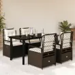 Ta vrtna jedilna garnitura je odlična izbira za večerjo na prostem ali za sprostitev na vrtu, dvorišču ali terasi. Vzdržljiv material: PE ratan, znan tudi kot poli ratan, je močan sintetični material, ki zahteva malo vzdrževanja in je videti kot naravni ratan. Je lahek, enostaven za čiščenje in se zaradi svoje vzdržljivosti in odpornosti na vremenske vplive pogosto uporablja za zunanje pohištvo.Nastavljivo naslonjalo: Ta vrtni sedež ima ročaj. S potegom ročaja lahko naslonjalo nastavite v poljuben položaj in ga hitro vrnete v prvotni položaj.Udobno sedenje: To zunanje pohištvo z debelo oblazinjenimi blazinami zagotavlja udobno sedenje.Prevleko je mogoče odstraniti in oprati: Sedežna blazina ima odstranljivo prevleko za enostavno pranje in vzdrževanje.Steklena mizna plošča: Površina zunanje mize je izdelana iz močnega in trpežnega kaljenega stekla, kar omogoča enostavno čiščenje z vlažno krpo in vašemu zunanjemu prostoru doda pridih elegance. Dobro je vedeti:Če želite, da vaše zunanje pohištvo ostane lepo, vam priporočamo, da ga zaščitite z vodoodporno prevleko.Maksimalna nosilnost (na sedež): 110 kgUV-odpornoPotrebno sestavljanje: DaMiza:Barva: ČrnaMaterial: Jeklo s prašnim premazom, kaljeno stekloDimenzije mize: 160 x 80 x 74 cm (D x Š x V)Vrtni naslanjač:Barva: RjavaMaterial: PE ratan, jeklen okvir s prašnim premazomDimenzije v sedečem položaju: 55 x 60 x 93 cm (Š x G x V)Dimenzije v ležečem položaju: 55 x 89 x 83 cm (Š x G x V)Velikost sedeža: 48 x 55 cm (Š x G)Višina sedeža, merjena od tal: 42 cmVišina naslonjala za roke, merjena od tal: 58 cmBlazina:Barva: Kremno belaMaterial prevleke: Tkanina (100 % poliester)Polnilo sedežne blazine: PenaPolnilo hrbtne blazine: bombažna vlaknaDimenzije sedežne blazine: 48 x 55 x 3 cm (Š x G x D)Dimenzije hrbtne blazine: 48 x 50 x 10 cm (D x Š x D)Paket vsebuje:1 x Vrtna miza4 x Vrtni stol s funkcijo nagiba4 x Blazina za hrbet4 x Sedežna blazina s snemljivo in pralno prevleko 3262981