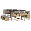 Ta vrtna jedilna garnitura je odlična izbira za večerjo na prostem ali za sprostitev na vrtu, dvorišču ali terasi. Vzdržljiv material: PE ratan, znan tudi kot poli ratan, je močan sintetični material, ki zahteva malo vzdrževanja in je videti kot naravni ratan. Je lahek, enostaven za čiščenje in se zaradi svoje vzdržljivosti in odpornosti na vremenske vplive pogosto uporablja za zunanje pohištvo.Kompaktno shranjevanje: Te stole je mogoče zložiti, zato jih je enostavno shraniti pod mizo. Ko so zloženi, se lepo prilegajo pod mizo in tvorijo prostorsko varčno kocko. Poleg tega je mogoče stolčke shraniti tudi pod stole, kar še poveča prostorsko učinkovitost.Udobno sedenje: To zunanje pohištvo z debelo oblazinjenimi blazinami zagotavlja udobno sedenje.Prevleko je mogoče odstraniti in oprati: Te sedežne blazine imajo odstranljive prevleke za lažje pranje in vzdrževanje. Prevleke za blazine imajo na zadnji strani zavihek za enostavno pritrditev na naslonjala.Steklena mizna plošča: Površina zunanje mize je izdelana iz močnega in trpežnega kaljenega stekla, kar omogoča enostavno čiščenje z vlažno krpo in vašemu zunanjemu prostoru doda pridih elegance. Dobro je vedeti: Če želite, da vaše zunanje pohištvo ostane lepo, vam priporočamo, da ga zaščitite z vodoodporno prevleko.Maksimalna nosilnost (na sedež): 110 kg UV-odporno Potrebno sestavljanje: Da Miza: Barva mize: Mešano bežBarva stekla: ČrnaMaterial: PE ratan, jeklo s prašnim premazom, kaljeno stekloDimenzije: 165 x 106 x 73 cm (D x Š x V) Stol: Barva: Mešano bež Material: PE ratan, jeklen okvir s prašnim premazom Dimenzije: 50,5 x 50 x 79 cm (Š x G x V) Velikost sedišča: 45,5 x 38 cm (Š x G) Višina sedišča, merjena od tal: 43 cm Višina naslonjal za roke, merjena od tal: 63,5 cm Stolček: Barva: Mešano bež Material: PE ratan, jeklen okvir s prašnim premazom Dimenzije: 41 x 41 x 36 cm (Š x G x V) Blazina: Barva: Svetlo siva Material prevleke: Tkanina (100 % poliester) Material polnila: Pena Dimenzije blazine za stol: 76 x 46 x 2 cm (D x Š x D)Dimenzije blazine za stolček: 40 x 40 x 2 cm (Š x G x D) Paket vsebuje:1 x Vrtna miza 6 x Vrtni stol 4 x Vrtni stolček 4 x Sedežna blazina za stolček s snemljivo in pralno prevleko 6 x Blazina za stol z visokim naslonom s snemljivo in pralno prevleko 3278099