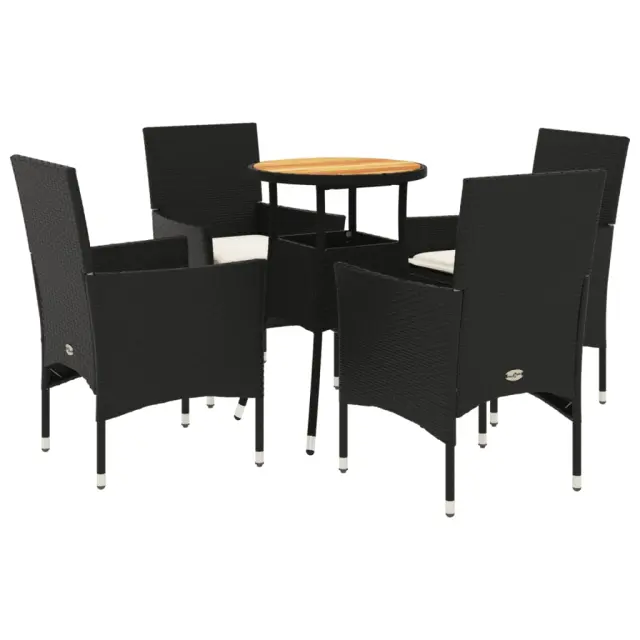 Ta vrtna jedilna garnitura je odlična izbira za večerjo na prostem ali za sprostitev na vrtu, dvorišču ali terasi. Vzdržljiv material: PE ratan, znan tudi kot poli ratan, je močan sintetični material, ki zahteva malo vzdrževanja in je videti kot naravni ratan. Je lahek, enostaven za čiščenje in se zaradi svoje vzdržljivosti in odpornosti na vremenske vplive pogosto uporablja za zunanje pohištvo.Udobno sedenje: Ta zunanja garnitura z debelo podloženimi blazinami zagotavlja udobno sedenje.Prevleko je mogoče odstraniti in oprati: Te sedežne blazine imajo odstranljive prevleke za lažje pranje in vzdrževanje.Stabilna mizna plošča, ki je enostavna za čiščenje: Ta vrtna miza ima ploščo iz akacijevega lesa, ki je čvrsta, vzdržljiva in jo je enostavno čistiti z vlažno krpo. Dobro je vedeti:Če želite, da vaše zunanje pohištvo ostane lepo, vam priporočamo, da ga zaščitite z vodoodporno prevleko.UV-odpornoPotrebno sestavljanje: DaMiza:Barva: ČrnaMaterial: PE ratan, prašno premazano jeklo, trden akacijev les z oljnim premazomDimenzije: 60 x 75 cm (premer x V)Stol:Barva: ČrnaMaterial: PE ratan, jeklen okvir s prašnim premazomDimenzije: 53 x 61 x 83 cm (Š x G x V)Velikost sedeža: 44 x 47 cm (Š x G)Višina sedeža od tal (brez blazine): 42 cmVišina naslonjal za roke, merjena od tal: 60 cmMaksimalna nosilnost (na sedež): 110 kgSedežna blazina:Barva: Kremno belaMaterial prevleke: Tkanina (100 % poliester)Material polnila: PenaDimenzije: 44 x 46 x 2,5 cm (Š x G x D) Paket vsebuje:1 x Vrtna miza4 x Vrtni stol4 x Sedežna blazina s snemljivo in pralno prevleko 3278728