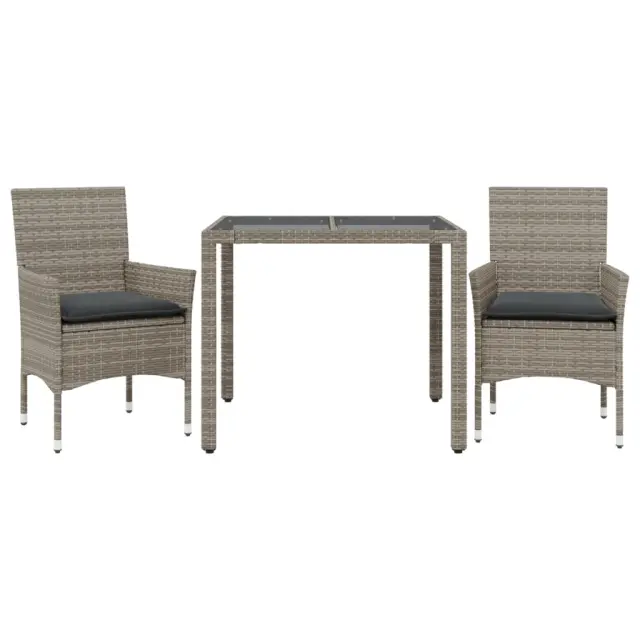 Ta vrtna jedilna garnitura je odlična izbira za večerjo na prostem ali za sprostitev na vrtu, dvorišču ali terasi. Vzdržljiv material: PE ratan, znan tudi kot poli ratan, je močan sintetični material, ki zahteva malo vzdrževanja in je videti kot naravni ratan. Je lahek, enostaven za čiščenje in se zaradi svoje vzdržljivosti in odpornosti na vremenske vplive pogosto uporablja za zunanje pohištvo.Udobno sedenje: Ta zunanja garnitura z debelo podloženimi blazinami zagotavlja udobno sedenje.Prevleko je mogoče odstraniti in oprati: Te sedežne blazine imajo odstranljive prevleke za lažje pranje in vzdrževanje.Steklena mizna plošča: Površina zunanje mize je izdelana iz močnega in trpežnega kaljenega stekla, kar omogoča enostavno čiščenje z vlažno krpo in vašemu zunanjemu prostoru doda pridih elegance. Dobro je vedeti:Če želite, da vaše zunanje pohištvo ostane lepo, vam priporočamo, da ga zaščitite z vodoodporno prevleko.UV-odpornoPotrebno sestavljanje: DaMiza:Barva: SivaMaterial: PE ratan, jeklo s prašnim premazom, kaljeno stekloDimenzije: 90 x 90 x 75 cm (Š x G x V)Stol:Barva: SivaMaterial: PE ratan, jeklen okvir s prašnim premazomDimenzije: 53 x 61 x 83 cm (Š x G x V)Velikost sedeža: 44 x 47 cm (Š x G)Višina sedeža od tal (brez blazine): 42 cmVišina naslonjal za roke, merjena od tal: 60 cmMaksimalna nosilnost (na sedež): 110 kgSedežna blazina:Barva: Temno sivaMaterial prevleke: Tkanina (100 % poliester)Material polnila: PenaDimenzije: 44 x 46 x 2,5 cm (Š x G x D) Paket vsebuje:1 x Vrtna miza2 x Vrtni stol2 x Sedežna blazina s snemljivo pralno prevleko 3278555