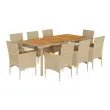 Ta vrtna jedilna garnitura je odlična izbira za večerjo na prostem ali za sprostitev na vrtu, dvorišču ali terasi. Vzdržljiv material: PE ratan, znan tudi kot poli ratan, je močan sintetični material, ki zahteva malo vzdrževanja in je videti kot naravni ratan. Je lahek, enostaven za čiščenje in se zaradi svoje vzdržljivosti in odpornosti na vremenske vplive pogosto uporablja za zunanje pohištvo.Udobno sedenje: Ta zunanja garnitura z debelo podloženimi blazinami zagotavlja udobno sedenje.Prevleko je mogoče odstraniti in oprati: Te sedežne blazine imajo odstranljive prevleke za lažje pranje in vzdrževanje.Stabilna mizna plošča, ki je enostavna za čiščenje: Ta vrtna miza ima ploščo iz akacijevega lesa, ki je čvrsta, vzdržljiva in jo je enostavno čistiti z vlažno krpo. Dobro je vedeti:Če želite, da vaše zunanje pohištvo ostane lepo, vam priporočamo, da ga zaščitite z vodoodporno prevleko.UV-odpornoPotrebno sestavljanje: DaMiza:Barva: BežMaterial: PE ratan, prašno premazano jeklo, trden akacijev les z oljnim premazomDimenzije: 190 x 90 x 75 cm (Š x G x V)Stol:Barva: BežMaterial: PE ratan, prašno premazano jeklo, trden akacijev les z oljnim premazomDimenzije: 53 x 61 x 83 cm (Š x G x V)Velikost sedeža: 44 x 47 cm (Š x G)Višina sedeža od tal (brez blazine): 42 cmVišina naslonjal za roke, merjena od tal: 60 cmMaksimalna nosilnost (na sedež): 110 kgSedežna blazina:Barva: Kremno belaMaterial prevleke: Tkanina (100 % poliester)Material polnila: PenaDimenzije: 44 x 46 x 2,5 cm (Š x G x D) Paket vsebuje:1 x Vrtna miza8 x Vrtni stol8 x Sedežna blazina s snemljivo in pralno prevleko 3278644