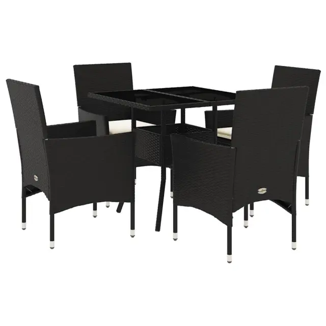 Ta vrtna jedilna garnitura je odlična izbira za večerjo na prostem ali za sprostitev na vrtu, dvorišču ali terasi. Vzdržljiv material: PE ratan, znan tudi kot poli ratan, je močan sintetični material, ki zahteva malo vzdrževanja in je videti kot naravni ratan. Je lahek, enostaven za čiščenje in se zaradi svoje vzdržljivosti in odpornosti na vremenske vplive pogosto uporablja za zunanje pohištvo.Udobno sedenje: Ta zunanja garnitura z debelo podloženimi blazinami zagotavlja udobno sedenje.Prevleko je mogoče odstraniti in oprati: Te sedežne blazine imajo odstranljive prevleke za lažje pranje in vzdrževanje.Steklena mizna plošča: Površina zunanje mize je izdelana iz močnega in trpežnega kaljenega stekla, kar omogoča enostavno čiščenje z vlažno krpo in vašemu zunanjemu prostoru doda pridih elegance. Dobro je vedeti:Če želite, da vaše zunanje pohištvo ostane lepo, vam priporočamo, da ga zaščitite z vodoodporno prevleko.UV-odpornoPotrebno sestavljanje: DaMiza:Barva: ČrnaMaterial: PE ratan, jeklo s prašnim premazom, kaljeno stekloDimenzije: 80 x 80 x 75 cm (Š x G x V)Stol:Barva: ČrnaMaterial: PE ratan, jeklen okvir s prašnim premazomDimenzije: 53 x 61 x 83 cm (Š x G x V)Velikost sedeža: 44 x 47 cm (Š x G)Višina sedeža od tal (brez blazine): 42 cmVišina naslonjal za roke, merjena od tal: 60 cmMaksimalna nosilnost (na sedež): 110 kgSedežna blazina:Barva: Kremno belaMaterial prevleke: Tkanina (100 % poliester)Material polnila: PenaDimenzije: 44 x 46 x 2,5 cm (Š x G x D) Paket vsebuje:1 x Vrtna miza4 x Vrtni stol4 x Sedežna blazina s snemljivo in pralno prevleko 3278600