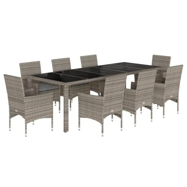 vidaXL Vrtna jedilna garnitura 9-delna blazine siv poli ratan steklo