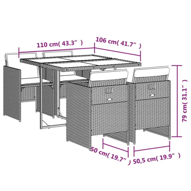 Ta vrtna jedilna garnitura je odlična izbira za večerjo na prostem ali za sprostitev na vrtu, dvorišču ali terasi. Vzdržljiv material: PE ratan, znan tudi kot poli ratan, je močan sintetični material, ki zahteva malo vzdrževanja in je videti kot naravni ratan. Je lahek, enostaven za čiščenje in se zaradi svoje vzdržljivosti in odpornosti na vremenske vplive pogosto uporablja za zunanje pohištvo.Kompaktno shranjevanje: Te stole je mogoče zložiti, zato jih je enostavno shraniti pod mizo. Ko so zloženi, se lepo prilegajo pod mizo in tvorijo prostorsko varčno kocko. Udobno sedenje: To zunanje pohištvo z debelo oblazinjenimi blazinami zagotavlja udobno sedenje.Prevleko je mogoče odstraniti in oprati: Te sedežne blazine imajo odstranljive prevleke za lažje pranje in vzdrževanje.Stabilna mizna plošča, ki je enostavna za čiščenje: Ta vrtna miza ima ploščo iz akacijevega lesa, ki je čvrsta, vzdržljiva in jo je enostavno čistiti z vlažno krpo. Dobro je vedeti: Če želite, da vaše zunanje pohištvo ostane lepo, vam priporočamo, da ga zaščitite z vodoodporno prevleko.Maksimalna nosilnost (na sedež): 110 kg UV-odporno Potrebno sestavljanje: Da Miza: Barva: Siva in rjavaMaterial: PE ratan, prašno premazano jeklo, trden akacijev les z oljnim premazomDimenzije: 110 x 106 x 73 cm (D x Š x V) Stol: Barva: SivaMaterial: PE ratan, jeklen okvir s prašnim premazom Dimenzije: 50,5 x 54 x 79 cm (Š x G x V) Velikost sedišča: 45,5 x 38 cm (Š x G) Višina sedišča, merjena od tal: 43 cm Višina naslonjal za roke, merjena od tal: 63,5 cmBlazina: Barva: Temno siva Material prevleke: Tkanina (100 % poliester) Material polnila: Pena Dimenzije blazine za stol: 76 x 46 x 2 cm (D x Š x D)Paket vsebuje:1 x Vrtna miza 4 x Vrtni stol4 x Blazina za stol z visokim naslonom s snemljivo in pralno prevleko 3277669
