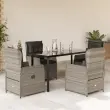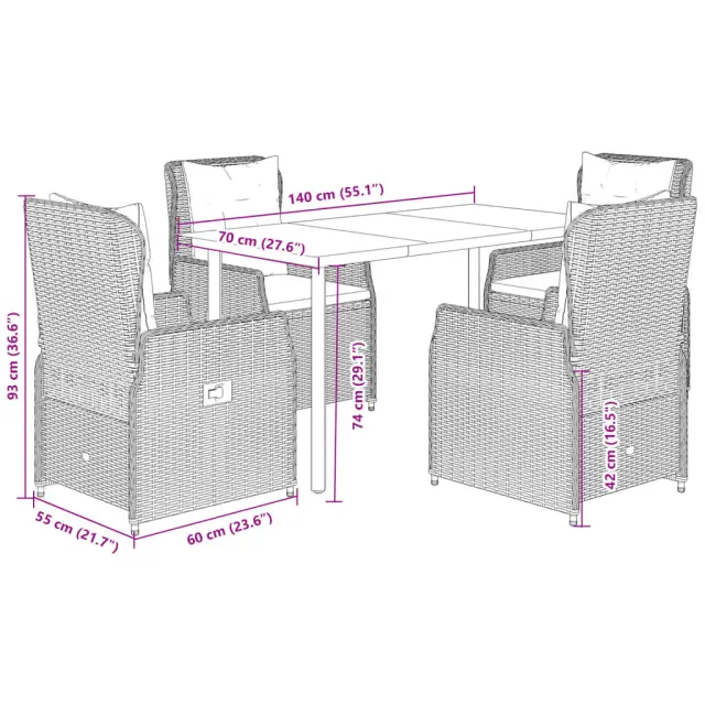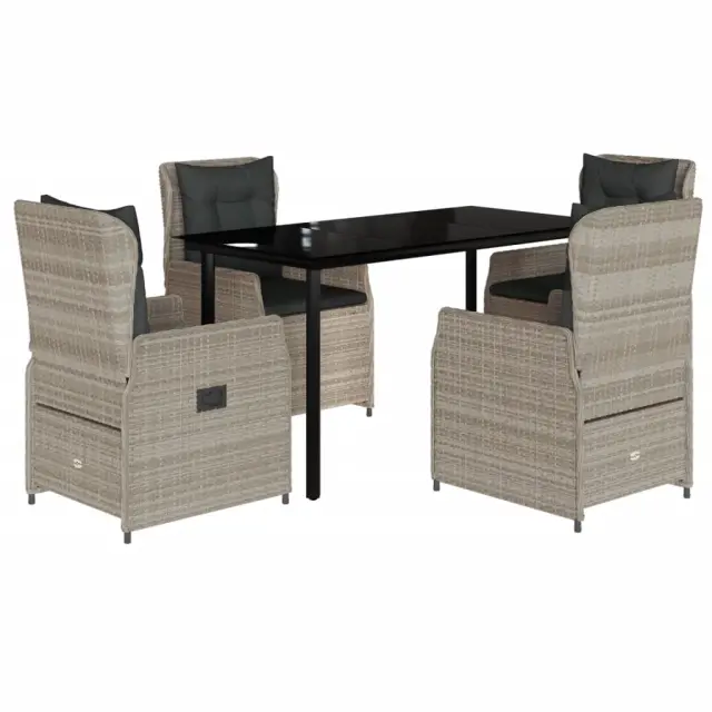 Ta vrtna jedilna garnitura je odlična izbira za večerjo na prostem ali za sprostitev na vrtu, dvorišču ali terasi. Vzdržljiv material: PE ratan, znan tudi kot poli ratan, je močan sintetični material, ki zahteva malo vzdrževanja in je videti kot naravni ratan. Je lahek, enostaven za čiščenje in se zaradi svoje vzdržljivosti in odpornosti na vremenske vplive pogosto uporablja za zunanje pohištvo.Nastavljivo naslonjalo: Ta vrtni sedež ima ročaj. S potegom ročaja lahko naslonjalo nastavite v poljuben položaj in ga hitro vrnete v prvotni položaj.Udobno sedenje: To zunanje pohištvo z debelo oblazinjenimi blazinami zagotavlja udobno sedenje.Prevleko je mogoče odstraniti in oprati: Sedežna blazina ima odstranljivo prevleko za enostavno pranje in vzdrževanje.Steklena mizna plošča: Površina zunanje mize je izdelana iz močnega in trpežnega kaljenega stekla, kar omogoča enostavno čiščenje z vlažno krpo in vašemu zunanjemu prostoru doda pridih elegance. Dobro je vedeti:Če želite, da vaše zunanje pohištvo ostane lepo, vam priporočamo, da ga zaščitite z vodoodporno prevleko.Maksimalna nosilnost (na sedež): 110 kgUV-odpornoPotrebno sestavljanje: DaMiza:Barva: ČrnaMaterial: Jeklo s prašnim premazom, kaljeno stekloDimenzije: 140 x 70 x 74 cm (D x Š x V)Vrtni naslanjač:Barva: Svetlo sivaMaterial: PE ratan, jeklen okvir s prašnim premazomDimenzije v sedečem položaju: 55 x 60 x 93 cm (Š x G x V)Dimenzije v ležečem položaju: 55 x 89 x 83 cm (Š x G x V)Velikost sedeža: 48 x 55 cm (Š x G)Višina sedeža, merjena od tal: 42 cmVišina naslonjala za roke, merjena od tal: 58 cmBlazina:Barva: Temno sivaMaterial prevleke: Tkanina (100 % poliester)Polnilo sedežne blazine: PenaPolnilo hrbtne blazine: bombažna vlaknaDimenzije sedežne blazine: 48 x 55 x 3 cm (Š x G x D)Dimenzije hrbtne blazine: 48 x 50 x 10 cm (D x Š x D)Paket vsebuje:1 x Vrtna miza4 x Vrtni stol s funkcijo nagiba4 x Blazina za hrbet4 x Sedežna blazina s snemljivo in pralno prevleko 3262905