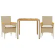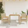 Ta vrtna jedilna garnitura je odlična izbira za večerjo na prostem ali za sprostitev na vrtu, dvorišču ali terasi. Vzdržljiv material: PE ratan, znan tudi kot poli ratan, je močan sintetični material, ki zahteva malo vzdrževanja in je videti kot naravni ratan. Je lahek, enostaven za čiščenje in se zaradi svoje vzdržljivosti in odpornosti na vremenske vplive pogosto uporablja za zunanje pohištvo.Udobno sedenje: Ta zunanja garnitura z debelo podloženimi blazinami zagotavlja udobno sedenje.Prevleko je mogoče odstraniti in oprati: Te sedežne blazine imajo odstranljive prevleke za lažje pranje in vzdrževanje.Stabilna mizna plošča, ki je enostavna za čiščenje: Ta vrtna miza ima ploščo iz akacijevega lesa, ki je čvrsta, vzdržljiva in jo je enostavno čistiti z vlažno krpo. Dobro je vedeti:Če želite, da vaše zunanje pohištvo ostane lepo, vam priporočamo, da ga zaščitite z vodoodporno prevleko.UV-odpornoPotrebno sestavljanje: DaMiza:Barva: BežMaterial: PE ratan, prašno premazano jeklo, trden akacijev les z oljnim premazomDimenzije: 90 x 90 x 75 cm (Š x G x V)Stol:Barva: BežMaterial: PE ratan, prašno premazano jeklo, trden akacijev les z oljnim premazomDimenzije: 53 x 61 x 83 cm (Š x G x V)Velikost sedeža: 44 x 47 cm (Š x G)Višina sedeža od tal (brez blazine): 42 cmVišina naslonjal za roke, merjena od tal: 60 cmMaksimalna nosilnost (na sedež): 110 kgSedežna blazina:Barva: Kremno belaMaterial prevleke: Tkanina (100 % poliester)Material polnila: PenaDimenzije: 44 x 46 x 2,5 cm (Š x G x D)Paket vsebuje:1 x Vrtna miza2 x Vrtni stol2 x Sedežna blazina s snemljivo pralno prevleko 3278639
