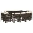 Ta vrtna jedilna garnitura je odlična izbira za večerjo na prostem ali za sprostitev na vrtu, dvorišču ali terasi. Vzdržljiv material: PE ratan, znan tudi kot poli ratan, je močan sintetični material, ki zahteva malo vzdrževanja in je videti kot naravni ratan. Je lahek, enostaven za čiščenje in se zaradi svoje vzdržljivosti in odpornosti na vremenske vplive pogosto uporablja za zunanje pohištvo.Kompaktno shranjevanje: Te stole je mogoče zložiti, zato jih je enostavno shraniti pod mizo. Ko so zloženi, se lepo prilegajo pod mizo in tvorijo prostorsko varčno kocko.Udobno sedenje: To zunanje pohištvo z debelo oblazinjenimi blazinami zagotavlja udobno sedenje.Prevleko je mogoče odstraniti in oprati: Te blazine imajo odstranljive prevleke za lažje pranje in vzdrževanje. Prevleke za blazine za stole imajo na zadnji strani zavihek za enostavno pritrditev na stole.Steklena mizna plošča: Površina zunanje mize je izdelana iz močnega in trpežnega kaljenega stekla, kar omogoča enostavno čiščenje z vlažno krpo in vašemu zunanjemu prostoru doda pridih elegance. Dobro je vedeti: Če želite, da vaše zunanje pohištvo ostane lepo, vam priporočamo, da ga zaščitite z vodoodporno prevleko.Maksimalna nosilnost (na sedež): 110 kgUV-odpornoPotrebno sestavljanje: DaMiza:Barva: Rjava in črnaMaterial: PE ratan, jeklo s prašnim premazom, kaljeno stekloDimenzije: 165 x 106 x 73 cm (D x Š x V)Stol:Barva: RjavaMaterial: PE ratan, jeklen okvir s prašnim premazomDimenzije: 50,5 x 54 x 79 cm (Š x G x V)Velikost sedišča: 45,5 x 38 cm (Š x G)Višina sedišča, merjena od tal: 43 cmVišina naslonjal za roke, merjena od tal: 63,5 cmBlazina:Barva: Kremno belaMaterial prevleke: Tkanina (100 % poliester)Material polnila: PenaDimenzije blazine za stol: 76 x 46 x 2 cm (D x Š x D)Paket vsebuje:1 x Vrtna miza10 x Vrtni stol10 x Blazina za stol z visokim naslonom s snemljivo in pralno prevleko 3211029