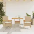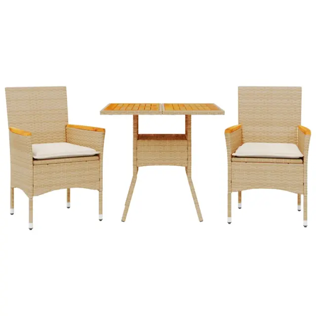 Ta vrtna jedilna garnitura je odlična izbira za večerjo na prostem ali za sprostitev na vrtu, dvorišču ali terasi. Vzdržljiv material: PE ratan, znan tudi kot poli ratan, je močan sintetični material, ki zahteva malo vzdrževanja in je videti kot naravni ratan. Je lahek, enostaven za čiščenje in se zaradi svoje vzdržljivosti in odpornosti na vremenske vplive pogosto uporablja za zunanje pohištvo.Udobno sedenje: Ta zunanja garnitura z debelo podloženimi blazinami zagotavlja udobno sedenje.Prevleko je mogoče odstraniti in oprati: Te sedežne blazine imajo odstranljive prevleke za lažje pranje in vzdrževanje.Stabilna mizna plošča, ki je enostavna za čiščenje: Ta vrtna miza ima ploščo iz akacijevega lesa, ki je čvrsta, vzdržljiva in jo je enostavno čistiti z vlažno krpo. Dobro je vedeti:Če želite, da vaše zunanje pohištvo ostane lepo, vam priporočamo, da ga zaščitite z vodoodporno prevleko.UV-odpornoPotrebno sestavljanje: DaMiza:Barva: BežMaterial: PE ratan, prašno premazano jeklo, trden akacijev les z oljnim premazomDimenzije: 80 x 80 x 75 cm (Š x G x V)Stol:Barva: BežMaterial: PE ratan, prašno premazano jeklo, trden akacijev les z oljnim premazomDimenzije: 53 x 61 x 83 cm (Š x G x V)Velikost sedeža: 44 x 47 cm (Š x G)Višina sedeža od tal (brez blazine): 42 cmVišina naslonjal za roke, merjena od tal: 60 cmMaksimalna nosilnost (na sedež): 110 kgSedežna blazina:Barva: Kremno belaMaterial prevleke: Tkanina (100 % poliester)Material polnila: PenaDimenzije: 44 x 46 x 2,5 cm (Š x G x D) Paket vsebuje:1 x Vrtna miza2 x Vrtni stol2 x Sedežna blazina s snemljivo pralno prevleko 3278701