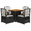 Ta vrtna jedilna garnitura je odlična izbira za večerjo na prostem ali za sprostitev na vrtu, dvorišču ali terasi. Vzdržljiv material: PE ratan, znan tudi kot poli ratan, je močan sintetični material, ki zahteva malo vzdrževanja in je videti kot naravni ratan. Je lahek, enostaven za čiščenje in se zaradi svoje vzdržljivosti in odpornosti na vremenske vplive pogosto uporablja za zunanje pohištvo.Nastavljivo naslonjalo: Ta vrtni sedež ima ročaj. S potegom ročaja lahko naslonjalo nastavite v poljuben položaj in ga hitro vrnete v prvotni položaj.Prevleko je mogoče odstraniti in oprati: Sedežna blazina ima odstranljivo prevleko za enostavno pranje in vzdrževanje.Nastavljiva mizna plošča: Z dvigom mizne plošče lahko mizo povišate, s čimer se zunanja klubska mizica spremeni v jedilno mizo. Popolna je za sprejemanje gostov ali uživanje v obrokih na prostem.Stabilna mizna plošča, ki je enostavna za čiščenje: Ta vrtna miza ima ploščo iz akacijevega lesa, ki je čvrsta, vzdržljiva in jo je enostavno čistiti z vlažno krpo. Dobro je vedeti:Če želite, da vaše zunanje pohištvo ostane lepo, vam priporočamo, da ga zaščitite z vodoodporno prevleko.Maksimalna nosilnost (na sedež): 110 kgUV-odpornoPotrebno sestavljanje: DaMiza:Barva: Črna in rjavaMaterial: PE ratan, prašno premazano jeklo, trden akacijev les z oljnim premazomDimenzije: 80 x 80 x 40/71 cm (D x Š x V)Vrtni naslanjač:Barva: ČrnaMaterial: PE ratan, jeklen okvir s prašnim premazomDimenzije v sedečem položaju: 55 x 60 x 93 cm (Š x G x V)Dimenzije v ležečem položaju: 55 x 89 x 83 cm (Š x G x V)Velikost sedeža: 48 x 55 cm (Š x G)Višina sedeža, merjena od tal: 42 cmVišina naslonjala za roke, merjena od tal: 58 cmBlazina:Barva: Kremno belaMaterial prevleke: Tkanina (100 % poliester)Polnilo sedežne blazine: PenaPolnilo hrbtne blazine: bombažna vlaknaDimenzije sedežne blazine: 48 x 55 x 3 cm (Š x G x D)Dimenzije hrbtne blazine: 48 x 50 x 10 cm (D x Š x D)Paket vsebuje:1 x Vrtna miza4 x Vrtni stol s funkcijo nagiba4 x Blazina za hrbet4 x Sedežna blazina s snemljivo in pralno prevleko 3262911