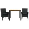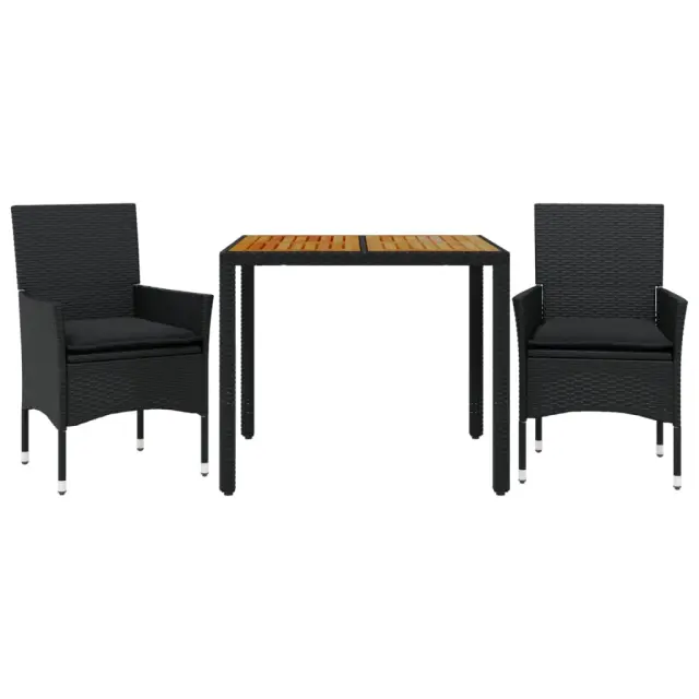Ta vrtna jedilna garnitura je odlična izbira za večerjo na prostem ali za sprostitev na vrtu, dvorišču ali terasi. Vzdržljiv material: PE ratan, znan tudi kot poli ratan, je močan sintetični material, ki zahteva malo vzdrževanja in je videti kot naravni ratan. Je lahek, enostaven za čiščenje in se zaradi svoje vzdržljivosti in odpornosti na vremenske vplive pogosto uporablja za zunanje pohištvo.Udobno sedenje: Ta zunanja garnitura z debelo podloženimi blazinami zagotavlja udobno sedenje.Prevleko je mogoče odstraniti in oprati: Te sedežne blazine imajo odstranljive prevleke za lažje pranje in vzdrževanje.Stabilna mizna plošča, ki je enostavna za čiščenje: Ta vrtna miza ima ploščo iz akacijevega lesa, ki je čvrsta, vzdržljiva in jo je enostavno čistiti z vlažno krpo. Dobro je vedeti:Če želite, da vaše zunanje pohištvo ostane lepo, vam priporočamo, da ga zaščitite z vodoodporno prevleko.UV-odpornoPotrebno sestavljanje: DaMiza:Barva: ČrnaMaterial: PE ratan, prašno premazano jeklo, trden akacijev les z oljnim premazomDimenzije: 90 x 90 x 75 cm (Š x G x V)Stol:Barva: ČrnaMaterial: PE ratan, jeklen okvir s prašnim premazomDimenzije: 53 x 61 x 83 cm (Š x G x V)Velikost sedeža: 44 x 47 cm (Š x G)Višina sedeža od tal (brez blazine): 42 cmVišina naslonjal za roke, merjena od tal: 60 cmMaksimalna nosilnost (na sedež): 110 kgSedežna blazina:Barva: ČrnaMaterial prevleke: Tkanina (100 % poliester)Material polnila: PenaDimenzije: 44 x 46 x 2,5 cm (Š x G x D) Paket vsebuje:1 x Vrtna miza2 x Vrtni stol2 x Sedežna blazina s snemljivo pralno prevleko 3278669