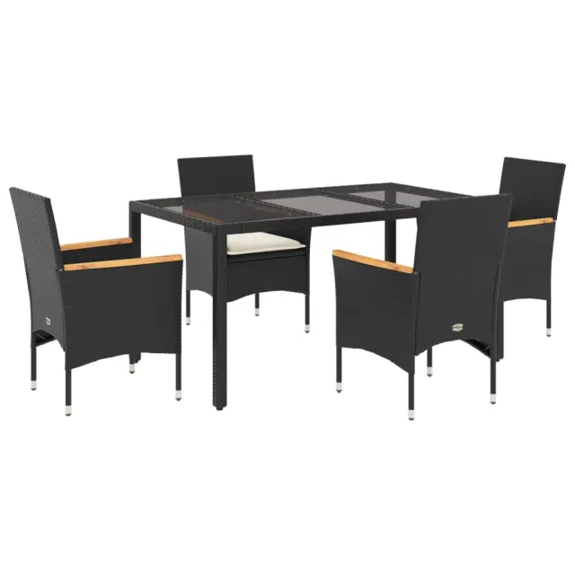 Ta vrtna jedilna garnitura je odlična izbira za večerjo na prostem ali za sprostitev na vrtu, dvorišču ali terasi. Vzdržljiv material: PE ratan, znan tudi kot poli ratan, je močan sintetični material, ki zahteva malo vzdrževanja in je videti kot naravni ratan. Je lahek, enostaven za čiščenje in se zaradi svoje vzdržljivosti in odpornosti na vremenske vplive pogosto uporablja za zunanje pohištvo.Udobno sedenje: Ta zunanja garnitura z debelo podloženimi blazinami zagotavlja udobno sedenje.Prevleko je mogoče odstraniti in oprati: Te sedežne blazine imajo odstranljive prevleke za lažje pranje in vzdrževanje.Steklena mizna plošča: Površina zunanje mize je izdelana iz močnega in trpežnega kaljenega stekla, kar omogoča enostavno čiščenje z vlažno krpo in vašemu zunanjemu prostoru doda pridih elegance. Dobro je vedeti:Če želite, da vaše zunanje pohištvo ostane lepo, vam priporočamo, da ga zaščitite z vodoodporno prevleko.UV-odpornoPotrebno sestavljanje: DaMiza:Barva: ČrnaMaterial: PE ratan, jeklo s prašnim premazom, kaljeno stekloDimenzije: 150 x 90 x 75 cm (Š x G x V)Stol:Barva: ČrnaMaterial: PE ratan, prašno premazano jeklo, trden akacijev les z oljnim premazomDimenzije: 53 x 61 x 83 cm (Š x G x V)Velikost sedeža: 44 x 47 cm (Š x G)Višina sedeža od tal (brez blazine): 42 cmVišina naslonjal za roke, merjena od tal: 60 cmMaksimalna nosilnost (na sedež): 110 kgSedežna blazina:Barva: Kremno belaMaterial prevleke: Tkanina (100 % poliester)Material polnila: PenaDimenzije: 44 x 46 x 2,5 cm (Š x G x D) Paket vsebuje:1 x Vrtna miza4 x Vrtni stol4 x Sedežna blazina s snemljivo in pralno prevleko 3278647
