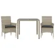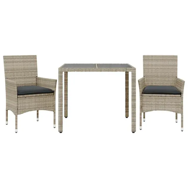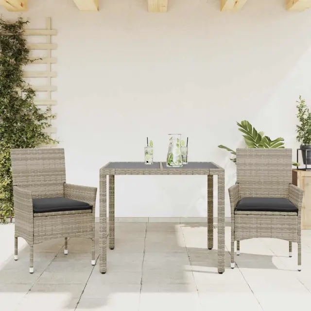 Ta vrtna jedilna garnitura je odlična izbira za večerjo na prostem ali za sprostitev na vrtu, dvorišču ali terasi. Vzdržljiv material: PE ratan, znan tudi kot poli ratan, je močan sintetični material, ki zahteva malo vzdrževanja in je videti kot naravni ratan. Je lahek, enostaven za čiščenje in se zaradi svoje vzdržljivosti in odpornosti na vremenske vplive pogosto uporablja za zunanje pohištvo.Udobno sedenje: Ta zunanja garnitura z debelo podloženimi blazinami zagotavlja udobno sedenje.Prevleko je mogoče odstraniti in oprati: Te sedežne blazine imajo odstranljive prevleke za lažje pranje in vzdrževanje.Steklena mizna plošča: Površina zunanje mize je izdelana iz močnega in trpežnega kaljenega stekla, kar omogoča enostavno čiščenje z vlažno krpo in vašemu zunanjemu prostoru doda pridih elegance. Dobro je vedeti:Če želite, da vaše zunanje pohištvo ostane lepo, vam priporočamo, da ga zaščitite z vodoodporno prevleko.UV-odpornoPotrebno sestavljanje: DaMiza:Barva: Svetlo sivaMaterial: PE ratan, jeklo s prašnim premazom, kaljeno stekloDimenzije: 90 x 90 x 75 cm (Š x G x V)Stol:Barva: Svetlo sivaMaterial: PE ratan, jeklen okvir s prašnim premazomDimenzije: 53 x 61 x 83 cm (Š x G x V)Velikost sedeža: 44 x 47 cm (Š x G)Višina sedeža od tal (brez blazine): 42 cmVišina naslonjal za roke, merjena od tal: 60 cmMaksimalna nosilnost (na sedež): 110 kgSedežna blazina:Barva: Temno sivaMaterial prevleke: Tkanina (100 % poliester)Material polnila: PenaDimenzije: 44 x 46 x 2,5 cm (Š x G x D) Paket vsebuje:1 x Vrtna miza2 x Vrtni stol2 x Sedežna blazina s snemljivo pralno prevleko 3278573