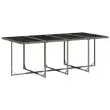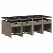 Ta vrtna jedilna garnitura je odlična izbira za večerjo na prostem ali za sprostitev na vrtu, dvorišču ali terasi. Vzdržljiv material: PE ratan, znan tudi kot poli ratan, je močan sintetični material, ki zahteva malo vzdrževanja in je videti kot naravni ratan. Je lahek, enostaven za čiščenje in se zaradi svoje vzdržljivosti in odpornosti na vremenske vplive pogosto uporablja za zunanje pohištvo.Kompaktno shranjevanje: Te stole je mogoče zložiti, zato jih je enostavno shraniti pod mizo. Ko so zloženi, se lepo prilegajo pod mizo in tvorijo prostorsko varčno kocko.Udobno sedenje: To zunanje pohištvo z debelo oblazinjenimi blazinami zagotavlja udobno sedenje.Prevleko je mogoče odstraniti in oprati: Te sedežne blazine imajo odstranljive prevleke za lažje pranje in vzdrževanje. Prevleke za blazine za stole imajo na zadnji strani zavihek za enostavno pritrditev na stole.Stabilna in enostavna za čiščenje namizna plošča: Ta vrtna miza ima mizno ploščo iz kaljenega stekla, ki je stabilna, vzdržljiva in jo je enostavno očistiti z vlažno krpo. Dobro je vedeti: Če želite, da vaše zunanje pohištvo ostane lepo, vam priporočamo, da ga zaščitite z vodoodporno prevleko.Maksimalna nosilnost (na sedež): 110 kg UV-odporno Potrebno sestavljanje: Da Miza: Barva mize: SivaBarva stekla: ČrnaMaterial: PE ratan, jeklo s prašnim premazom, kaljeno stekloDimenzije: 220 x 106 x 73 cm (D x Š x V) Stol: Barva: Siva Material: PE ratan, jeklen okvir s prašnim premazom Dimenzije: 50,5 x 54 x 79 cm (Š x G x V) Velikost sedišča: 45,5 x 38 cm (Š x G) Višina sedišča, merjena od tal: 43 cm Višina naslonjal za roke, merjena od tal: 63,5 cm Blazina: Barva: Temno siva Material prevleke: Tkanina (100 % poliester) Material polnila: Pena Dimenzije blazine za stol: 76 x 46 x 2 cm (D x Š x D) Paket vsebuje:1 x Vrtna miza 8 x Vrtni stol 8 x Blazina za stol z visokim naslonom s snemljivo in pralno prevleko 3277867