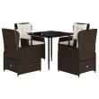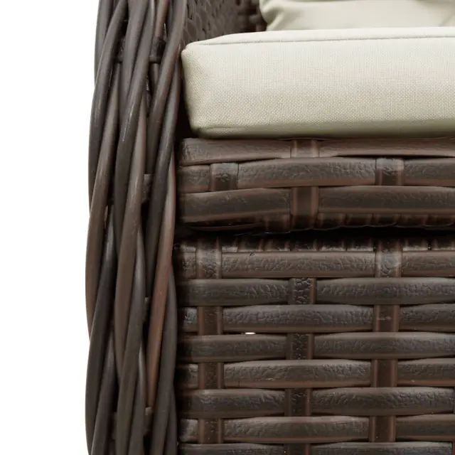 Ta vrtna jedilna garnitura je odlična izbira za večerjo na prostem ali za sprostitev na vrtu, dvorišču ali terasi. Vzdržljiv material: PE ratan, znan tudi kot poli ratan, je močan sintetični material, ki zahteva malo vzdrževanja in je videti kot naravni ratan. Je lahek, enostaven za čiščenje in se zaradi svoje vzdržljivosti in odpornosti na vremenske vplive pogosto uporablja za zunanje pohištvo.Nastavljivo naslonjalo: Ta vrtni sedež ima ročaj. S potegom ročaja lahko naslonjalo nastavite v poljuben položaj in ga hitro vrnete v prvotni položaj.Udobno sedenje: To zunanje pohištvo z debelo oblazinjenimi blazinami zagotavlja udobno sedenje.Prevleko je mogoče odstraniti in oprati: Sedežna blazina ima odstranljivo prevleko za enostavno pranje in vzdrževanje.Steklena mizna plošča: Površina zunanje mize je izdelana iz močnega in trpežnega kaljenega stekla, kar omogoča enostavno čiščenje z vlažno krpo in vašemu zunanjemu prostoru doda pridih elegance. Dobro je vedeti:Če želite, da vaše zunanje pohištvo ostane lepo, vam priporočamo, da ga zaščitite z vodoodporno prevleko.Maksimalna nosilnost (na sedež): 110 kgUV-odpornoPotrebno sestavljanje: DaMiza:Barva: ČrnaMaterial: Jeklo s prašnim premazom, kaljeno stekloDimenzije mize: 80 x 80 x 74 cm (D x Š x V)Vrtni naslanjač:Barva: RjavaMaterial: PE ratan, jeklen okvir s prašnim premazomDimenzije v sedečem položaju: 55 x 60 x 93 cm (Š x G x V)Dimenzije v ležečem položaju: 55 x 89 x 83 cm (Š x G x V)Velikost sedeža: 48 x 55 cm (Š x G)Višina sedeža, merjena od tal: 42 cmVišina naslonjala za roke, merjena od tal: 58 cmBlazina:Barva: Kremno belaMaterial prevleke: Tkanina (100 % poliester)Polnilo sedežne blazine: PenaPolnilo hrbtne blazine: bombažna vlaknaDimenzije sedežne blazine: 48 x 55 x 3 cm (Š x G x D)Dimenzije hrbtne blazine: 48 x 50 x 10 cm (D x Š x D)Paket vsebuje:1 x Vrtna miza4 x Vrtni stol s funkcijo nagiba4 x Blazina za hrbet4 x Sedežna blazina s snemljivo in pralno prevleko 3262841