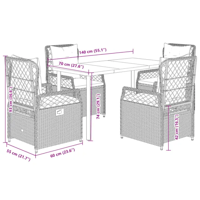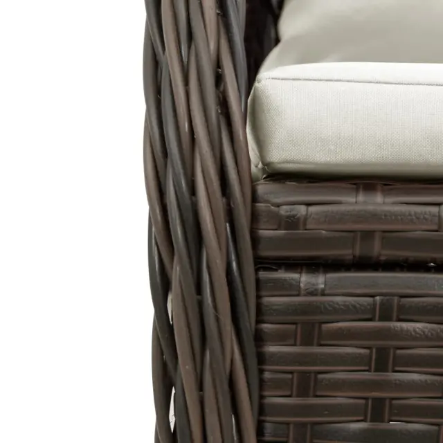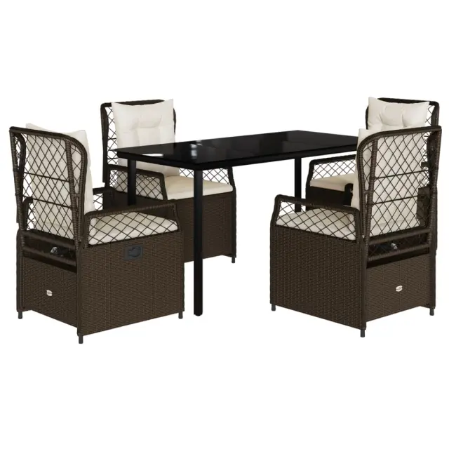 Ta vrtna jedilna garnitura je odlična izbira za večerjo na prostem ali za sprostitev na vrtu, dvorišču ali terasi. Vzdržljiv material: PE ratan, znan tudi kot poli ratan, je močan sintetični material, ki zahteva malo vzdrževanja in je videti kot naravni ratan. Je lahek, enostaven za čiščenje in se zaradi svoje vzdržljivosti in odpornosti na vremenske vplive pogosto uporablja za zunanje pohištvo.Nastavljivo naslonjalo: Ta vrtni sedež ima ročaj. S potegom ročaja lahko naslonjalo nastavite v poljuben položaj in ga hitro vrnete v prvotni položaj.Udobno sedenje: To zunanje pohištvo z debelo oblazinjenimi blazinami zagotavlja udobno sedenje.Prevleko je mogoče odstraniti in oprati: Sedežna blazina ima odstranljivo prevleko za enostavno pranje in vzdrževanje.Steklena mizna plošča: Površina zunanje mize je izdelana iz močnega in trpežnega kaljenega stekla, kar omogoča enostavno čiščenje z vlažno krpo in vašemu zunanjemu prostoru doda pridih elegance. Dobro je vedeti:Če želite, da vaše zunanje pohištvo ostane lepo, vam priporočamo, da ga zaščitite z vodoodporno prevleko.Maksimalna nosilnost (na sedež): 110 kgUV-odpornoPotrebno sestavljanje: DaMiza:Barva: ČrnaMaterial: Jeklo s prašnim premazom, kaljeno stekloDimenzije: 140 x 70 x 74 cm (D x Š x V)Vrtni naslanjač:Barva: RjavaMaterial: PE ratan, jeklen okvir s prašnim premazomDimenzije v sedečem položaju: 55 x 60 x 93 cm (Š x G x V)Dimenzije v ležečem položaju: 55 x 89 x 83 cm (Š x G x V)Velikost sedeža: 48 x 55 cm (Š x G)Višina sedeža, merjena od tal: 42 cmVišina naslonjala za roke, merjena od tal: 58 cmBlazina:Barva: Kremno belaMaterial prevleke: Tkanina (100 % poliester)Polnilo sedežne blazine: PenaPolnilo hrbtne blazine: bombažna vlaknaDimenzije sedežne blazine: 48 x 55 x 3 cm (Š x G x D)Dimenzije hrbtne blazine: 48 x 50 x 10 cm (D x Š x D)Paket vsebuje:1 x Vrtna miza4 x Vrtni stol s funkcijo nagiba4 x Blazina za hrbet4 x Sedežna blazina s snemljivo in pralno prevleko 3262980