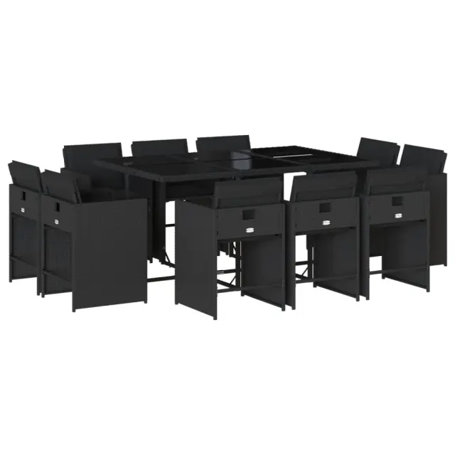 Ta vrtna jedilna garnitura je odlična izbira za večerjo na prostem ali za sprostitev na vrtu, dvorišču ali terasi. Vzdržljiv material: PE ratan, znan tudi kot poli ratan, je močan sintetični material, ki zahteva malo vzdrževanja in je videti kot naravni ratan. Je lahek, enostaven za čiščenje in se zaradi svoje vzdržljivosti in odpornosti na vremenske vplive pogosto uporablja za zunanje pohištvo.Kompaktno shranjevanje: Te stole je mogoče zložiti, zato jih je enostavno shraniti pod mizo. Ko so zloženi, se lepo prilegajo pod mizo in tvorijo prostorsko varčno kocko.Udobno sedenje: To zunanje pohištvo z debelo oblazinjenimi blazinami zagotavlja udobno sedenje.Prevleko je mogoče odstraniti in oprati: Te sedežne blazine imajo odstranljive prevleke za lažje pranje in vzdrževanje. Prevleke za blazine za stole imajo na zadnji strani zavihek za enostavno pritrditev na stole.Stabilna in enostavna za čiščenje namizna plošča: Ta vrtna miza ima mizno ploščo iz kaljenega stekla, ki je stabilna, vzdržljiva in jo je enostavno očistiti z vlažno krpo. Dobro je vedeti: Če želite, da vaše zunanje pohištvo ostane lepo, vam priporočamo, da ga zaščitite z vodoodporno prevleko.Maksimalna nosilnost (na sedež): 110 kg UV-odporno Potrebno sestavljanje: Da Miza: Barva mizice: ČrnaBarva stekla: ČrnaMaterial: PE ratan, jeklo s prašnim premazom, kaljeno stekloDimenzije: 165 x 106 x 73 cm (D x Š x V) Stol: Barva: Črna Material: PE ratan, jeklen okvir s prašnim premazom Dimenzije: 50,5 x 50 x 79 cm (Š x G x V) Velikost sedišča: 45,5 x 38 cm (Š x G) Višina sedišča, merjena od tal: 43 cm Višina naslonjal za roke, merjena od tal: 63,5 cm Blazina: Barva: Črna Material prevleke: Tkanina (100 % poliester) Material polnila: Pena Dimenzije blazine za stol: 76 x 46 x 2 cm (D x Š x D) Paket vsebuje:1 x Vrtna miza 10 x Vrtni stol 10 x Blazina za stol z visokim naslonom s snemljivo in pralno prevleko 3277974