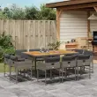 Ta vrtna jedilna garnitura je odlična izbira za večerjo na prostem ali za sprostitev na vrtu, dvorišču ali terasi. Vzdržljiv material: PE ratan, znan tudi kot poli ratan, je močan sintetični material, ki zahteva malo vzdrževanja in je videti kot naravni ratan. Je lahek, enostaven za čiščenje in se zaradi svoje vzdržljivosti in odpornosti na vremenske vplive pogosto uporablja za zunanje pohištvo.Kompaktno shranjevanje: Te stole je mogoče zložiti, zato jih je enostavno shraniti pod mizo. Ko so zloženi, se lepo prilegajo pod mizo in tvorijo prostorsko varčno kocko.Udobno sedenje: To zunanje pohištvo z debelo oblazinjenimi blazinami zagotavlja udobno sedenje.Prevleko je mogoče odstraniti in oprati: Te sedežne blazine imajo odstranljive prevleke za lažje pranje in vzdrževanje. Prevleke za blazine za stole imajo na zadnji strani zavihek za enostavno pritrditev na stole.Stabilna mizna plošča, ki je enostavna za čiščenje: Ta miza za teraso ima površino iz akacijevega lesa, ki je čvrsta, vzdržljiva in jo je enostavno čistiti z vlažno krpo. Dobro je vedeti:Če želite, da vaše zunanje pohištvo ostane lepo, vam priporočamo, da ga zaščitite z vodoodporno prevleko.Maksimalna nosilnost (na sedež): 110 kgUV-odpornoPotrebno sestavljanje: DaVrtna miza:Barva: SivaMaterial: PE ratan, prašno premazano jeklo, trden akacijev les z oljnim premazomDimenzije: 165 x 106 x 73 cm (D x Š x V)Vrtni stol:Barva: SivaMaterial: PE ratan, jeklen okvir s prašnim premazomDimenzije: 50,5 x 54 x 79 cm (Š x G x V)Velikost sedišča: 45,5 x 38 cm (Š x G)Višina sedišča, merjena od tal: 43 cmVišina naslonjal za roke, merjena od tal: 63,5 cmBlazina:Barva: Temno siva Material prevleke: Tkanina (100 % poliester)Material polnila: PenaDimenzije: 76 x 46 x 2 cm (Š x G x D)Paket vsebuje:1 x Vrtna miza10 x Vrtni stol10 x Blazina za stol z visokim naslonom s snemljivo in pralno prevleko 3278161