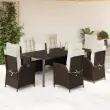 Ta vrtna jedilna garnitura je odlična izbira za večerjo na prostem ali za sprostitev na vrtu, dvorišču ali terasi. Vzdržljiv material: PE ratan, znan tudi kot poli ratan, je močan sintetični material, ki zahteva malo vzdrževanja in je videti kot naravni ratan. Je lahek, enostaven za čiščenje in se zaradi svoje vzdržljivosti in odpornosti na vremenske vplive pogosto uporablja za zunanje pohištvo.Nastavljivo naslonjalo: Ta vrtni sedež ima ročaj. S potegom ročaja lahko naslonjalo nastavite v poljuben položaj in ga hitro vrnete v prvotni položaj.Udobno sedenje: To zunanje pohištvo z debelo oblazinjenimi blazinami zagotavlja udobno sedenje.Prevleko je mogoče odstraniti in oprati: Te sedežne blazine imajo odstranljive prevleke za lažje pranje in vzdrževanje. Hrbtne blazine imajo na zadnji strani zavihek za enostavno pritrditev na naslonjala.Steklena mizna plošča: Površina zunanje mize je izdelana iz močnega in trpežnega kaljenega stekla, kar omogoča enostavno čiščenje z vlažno krpo in vašemu zunanjemu prostoru doda pridih elegance. Dobro je vedeti: Če želite, da vaše zunanje pohištvo ostane lepo, vam priporočamo, da ga zaščitite z vodoodporno prevleko.Maksimalna nosilnost (na sedež): 110 kgUV-odpornoPotrebno sestavljanje: DaMiza:Barva: ČrnaMaterial: Jeklo s prašnim premazom, kaljeno stekloDimenzije: 200 x 100 x 74 cm (D x Š x V)Vrtni naslanjač:Barva: RjavaMaterial: PE ratan, jeklen okvir s prašnim premazomDimenzije v sedečem položaju: 57 x 61 x 93 cm (Š x G x V)Dimenzije v ležečem položaju: 57 x 86 x 83 cm (Š x G x V)Velikost sedeža: 47 x 50 cm (Š x G)Višina sedeža od tal: 44 cmVišina naslonjala za roke, merjena od tal: 64 cmBlazina:Barva: Kremno belaMaterial prevleke: Tkanina (100 % poliester)Polnilo sedežne blazine: PenaPolnilo hrbtne blazine: bombažna vlaknaDimenzije sedežne blazine: 48 x 51 x 3 cm (Š x G x D)Dimenzije hrbtne blazine: 66 x 48 x 11 cm (D x Š x D)Paket vsebuje:1 x Vrtna miza6 x Vrtni stol s funkcijo nagiba6 x Blazina za hrbet6 x Sedežna blazina s snemljivo pralno prevleko 3213211
