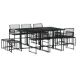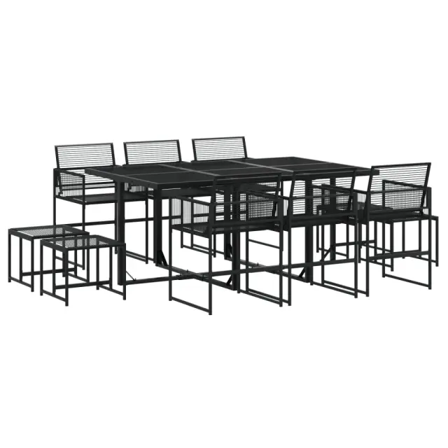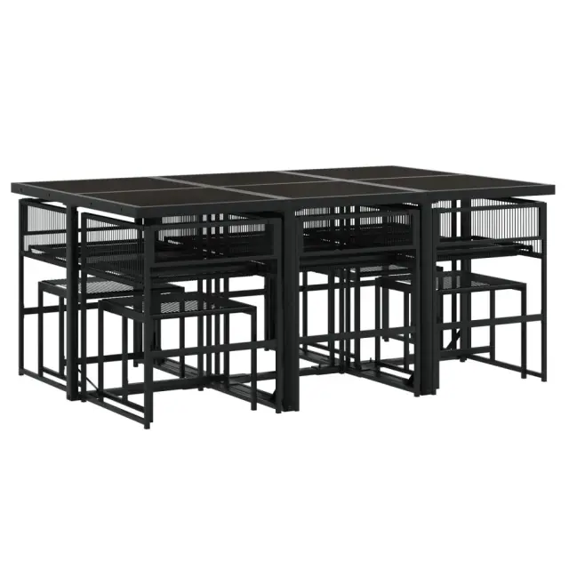 Ta vrtna jedilna garnitura je odlična izbira za večerjo na prostem ali za sprostitev na vrtu, dvorišču ali terasi. Vzdržljiv material: PE ratan, znan tudi kot poli ratan, je močan sintetični material, ki zahteva malo vzdrževanja in je videti kot naravni ratan. Je lahek, enostaven za čiščenje in se zaradi svoje vzdržljivosti in odpornosti na vremenske vplive pogosto uporablja za zunanje pohištvo.Kompaktno shranjevanje: Te vrtne stole je mogoče lepo pospraviti pod mizo in tako prihraniti prostor za shranjevanje.Steklena mizna plošča: Površina zunanje mize je izdelana iz močnega in trpežnega kaljenega stekla, kar omogoča enostavno čiščenje z vlažno krpo in vašemu zunanjemu prostoru doda pridih elegance.Robusten in stabilen okvir: Prašno barvan jekleni okvir zagotavlja, da je vrtno pohištvo močno in stabilno za vsakodnevno uporabo na prostem.Dobro je vedeti:Če želite, da vaše zunanje pohištvo ostane lepo, vam priporočamo, da ga zaščitite z vodoodporno prevleko.Maksimalna nosilnost (na sedež): 110 kgUV-odpornoPotrebno sestavljanje: DaMiza:Barva: ČrnaMaterial: Jeklo s prašnim premazom, kaljeno stekloDimenzije: 165 x 107 x 72 cm (D x Š x V)Stol:Barva: ČrnaMaterial: PE ratan, jeklen okvir s prašnim premazomDimenzije: 50,5 x 51 x 81,5 cm (Š x G x V)Velikost sedeža: 46 x 38 cm (Š x G)Višina sedeža od tal: 44 cmVišina naslonjal za roke, merjena od tal: 63,5 cmStolček:Barva: ČrnaMaterial: PE ratan, jeklen okvir s prašnim premazomDimenzije: 40 x 40 x 35 cm (Š x G x V)Paket vsebuje:1 x Vrtna miza6 x Vrtni stol4 x Vrtni stolček 3295044