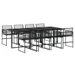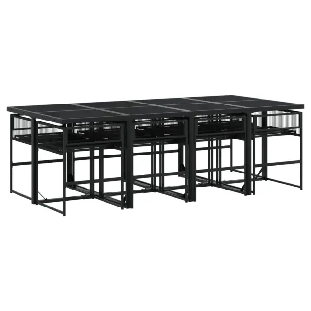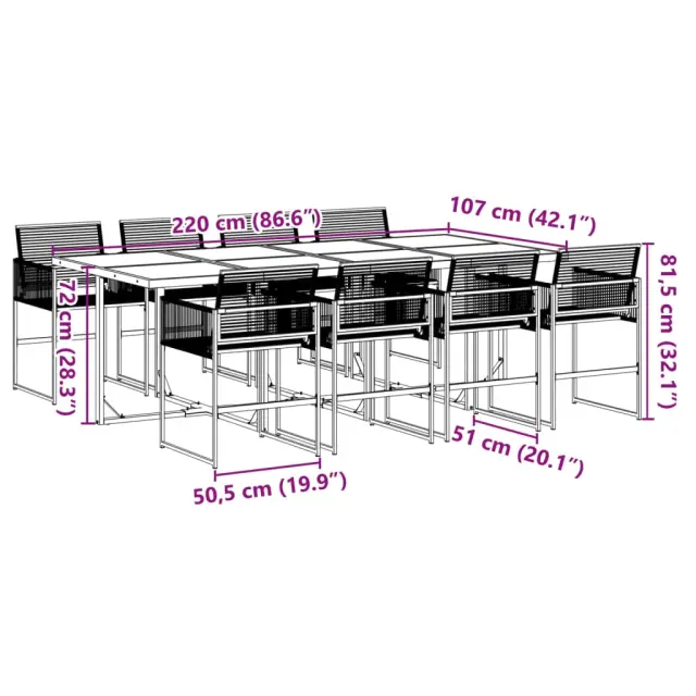 Ta vrtna jedilna garnitura je odlična izbira za večerjo na prostem ali za sprostitev na vrtu, dvorišču ali terasi. Vzdržljiv material: PE ratan, znan tudi kot poli ratan, je močan sintetični material, ki zahteva malo vzdrževanja in je videti kot naravni ratan. Je lahek, enostaven za čiščenje in se zaradi svoje vzdržljivosti in odpornosti na vremenske vplive pogosto uporablja za zunanje pohištvo. Steklena mizna plošča: Površina zunanje mize je izdelana iz močnega in trpežnega kaljenega stekla, kar omogoča enostavno čiščenje z vlažno krpo in vašemu zunanjemu prostoru doda pridih elegance. Kompaktno shranjevanje: Te stole je mogoče zložiti, zato jih je enostavno shraniti pod mizo. Ko so zloženi, se lepo prilegajo pod mizo in tvorijo prostorsko varčno kocko. Dobro je vedeti:Če želite, da vaše zunanje pohištvo ostane lepo, vam priporočamo, da ga zaščitite z vodoodporno prevleko.Maksimalna nosilnost (na sedež): 110 kgUV-odpornoPotrebno sestavljanje: DaMiza:Barva: ČrnaMaterial: PE ratan, jeklo s prašnim premazom, stekloDimenzije: 220 x 107 x 72 cm (D x Š x V)Stol:Barva: ČrnaMaterial: PE ratan, jeklen okvir s prašnim premazomDimenzije: 50,5 x 51 x 81,5 cm (Š x G x V)Velikost sedeža: 47 x 38 cm (Š x G)Višina sedeža od tal: 44 cmVišina naslonjala za roke od tal: 65 cmPaket vsebuje:1 x Vrtna miza8 x Vrtni stol 3295050