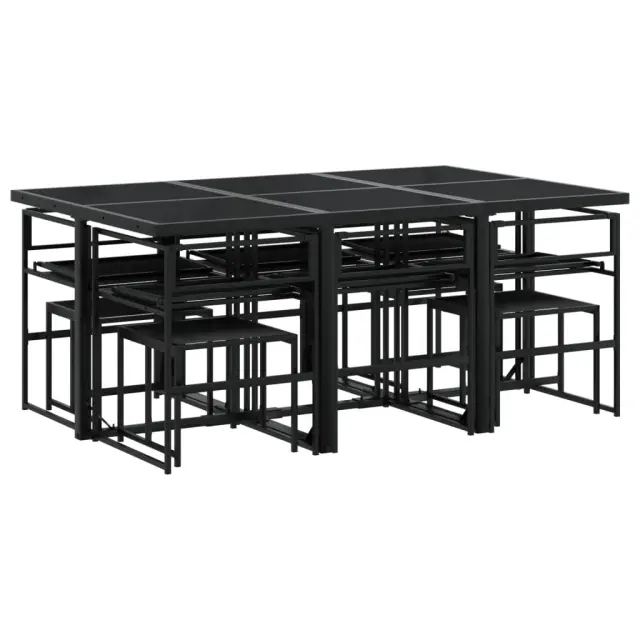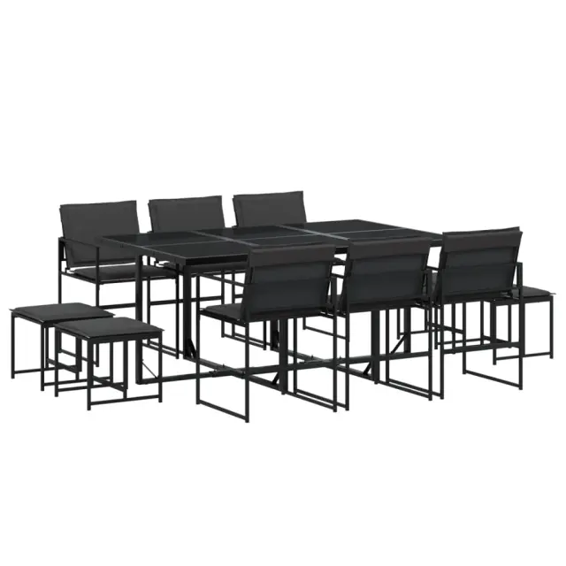 Ta vrtna jedilna garnitura je odlična izbira za večerjo na prostem ali za sprostitev na vrtu, dvorišču ali terasi. Trpežno in dolgotrajno: Zaradi svoje trajnosti, odpornosti na vodo in bledenje, enostavnega vzdrževanja ter zaščite pred UV žarki in plesnijo je tkanina iz tekstilena idealna izbira za zunanje pohištvo in konstrukcije za zagotavljanje sence.Kompaktno shranjevanje: Te stole je mogoče zložiti, zato jih je enostavno shraniti pod mizo. Ko so zloženi, se lepo prilegajo pod mizo in tvorijo prostorsko varčno kocko.Prevleko je mogoče odstraniti in oprati: Te sedežne blazine imajo odstranljive prevleke za lažje pranje in vzdrževanje.Steklena mizna plošča: Površina zunanje mize je izdelana iz močnega in trpežnega kaljenega stekla, kar omogoča enostavno čiščenje z vlažno krpo in vašemu zunanjemu prostoru doda pridih elegance.Robusten in stabilen okvir: Prašno barvan jekleni okvir zagotavlja, da je vrtno pohištvo močno in stabilno za vsakodnevno uporabo na prostem.Dobro je vedeti:Če želite, da vaše zunanje pohištvo ostane lepo, vam priporočamo, da ga zaščitite z vodoodporno prevleko.Maksimalna nosilnost (na sedež): 110 kgUV-odpornoPotrebno sestavljanje: DaMiza:Barva: ČrnaMaterial: Jeklo s prašnim premazom, kaljeno stekloDimenzije: 165 x 107 x 72 cm (D x Š x V)Stol:Barva: ČrnaMaterial: Tekstilen, jeklo s prašnim premazomDimenzije: 50,5 x 51 x 81,5 cm (Š x G x V)Velikost sedeža: 46 x 38 cm (Š x G)Višina sedeža od tal: 44 cmVišina naslonjal za roke, merjena od tal: 63,5 cmStolček:Barva: ČrnaMaterial: Tekstilen, jeklo s prašnim premazomDimenzije: 40 x 40 x 35 cm (Š x G x V)Blazina:Barva: Temno sivaMaterial prevleke: Tkanina (100 % poliester)Material polnila: PenaDimenzije blazine za sedež: 46,5 x 37 x 2 cm (Š x G x V)Dimenzije hrbtne blazine: 45,5 x 43,5 x 2,5 cm (D × Š × D)Dimenzije blazine za stolček: 40,5 x 40,5 x 2 cm (Š x G x D)Paket vsebuje:1 x Vrtna miza6 x Vrtni stol4 x Vrtni stolček6 x Sedežna blazina s snemljivo pralno prevleko6 x Blazina za hrbet4 x Blazina za stolček s snemljivo in pralno prevleko 3295084