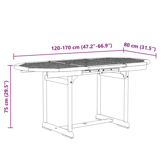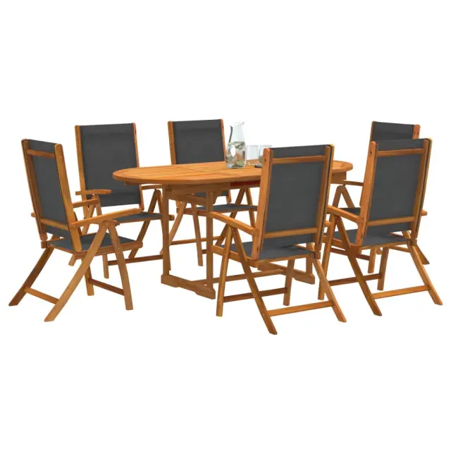 S to leseno vrtno jedilno garnituro lahko z družino in prijatelji uživate v prijetnem obroku na prostem. Trden akacijev les: Ta zunanja jedilna garnitura je izdelana iz trdnega akacijevega lesa. Trden akacijev les je čudovit naravni material. Akacijev les je tropski trden les, ki je gost, močan in vzdržljiv.Nastavljiva in zložljiva funkcija: Vrtni stol lahko nastavite v 5 položajev, tako da lahko vedno najdete najudobnejši položaj za sedenje. Lahko ga tudi zložite, da prihranite prostor, ko ga ne uporabljate.Praktična oblika: V mizni plošči je luknja za senčnik, tako da lahko preprosto pritrdite senčnik in ustvarite senčni kotiček.Trpežna mizna plošča: Ta jedilna miza ima robustno mizno ploščo. Nanjo lahko odložite svoje prigrizke, pijačo in vse svoje najljubše okrasne predmete.Površina, ki je enostavna za čiščenje: Ta vrtna jedilna miza in stoli se zlahka očistijo z vlažno krpo: površina je obdelana z oljem. Dobro je vedeti:Če želite, da vaše zunanje pohištvo ostane lepo, vam priporočamo, da ga zaščitite z vodoodporno prevleko.Vrtna miza:Material: Trden akacijev les z oljnim premazomDimenzije: (120-170) x 80 x 75 cm (D x Š x V)RaztegljivaVrtni stol:Barva: ČrnaMaterial: Trden akacijev les z oljnim premazom, tekstilDimenzije: 57,5 x 72 x 109 cm (Š x G x V)Višina sedišča, merjena od tal: 43 cmNastavljivo naslonjalo (5 položajev)Maksimalna nosilnost (na sedež): 110 kgPriložena blazina: NePotrebno sestavljanje: DaPaket vsebuje:1 x Vrtna miza6 x Vrtni stol 3279267