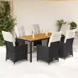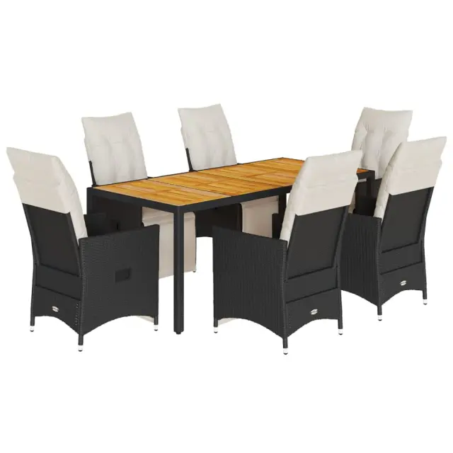 Ta vrtna jedilna garnitura je odlična izbira za večerjo na prostem ali za sprostitev na vrtu, dvorišču ali terasi. Vzdržljiv material: PE ratan, znan tudi kot poli ratan, je močan sintetični material, ki zahteva malo vzdrževanja in je videti kot naravni ratan. Je lahek, enostaven za čiščenje in se zaradi svoje vzdržljivosti in odpornosti na vremenske vplive pogosto uporablja za zunanje pohištvo.Nastavljivo naslonjalo za hrbet in podnožje: Ta vrtni sedež ima ročaj. Naslonjalo za hrbet in naslonjalo za noge lahko s potegom ročaja nastavite v poljuben položaj in ju hitro vrnete v prvotni položaj.Stabilna mizna plošča, ki je enostavna za čiščenje: Ta vrtna miza ima ploščo iz akacijevega lesa, ki je čvrsta, vzdržljiva in jo je enostavno čistiti z vlažno krpo.Udobno sedenje: Ta zunanja garnitura z debelo podloženimi blazinami zagotavlja udobno sedenje.Prevleko je mogoče odstraniti in oprati: Te sedežne blazine imajo odstranljive prevleke za lažje pranje in vzdrževanje. Hrbtne blazine imajo na zadnji strani zavihek za enostavno pritrditev na naslonjala. Dobro je vedeti:Če želite, da vaše zunanje pohištvo ostane lepo, vam priporočamo, da ga zaščitite z vodoodporno prevleko.UV-odpornoPotrebno sestavljanje: DaNastavljiv stol z oporo za noge:Barva: ČrnaMaterial: PE ratan, jeklen okvir s prašnim premazomDimenzije v sedečem položaju: 56 x 59 x 92 cm (Š x G x V)Dimenzije v ležečem položaju: 56 x 83 x 85 cm (Š x G x V)Velikost sedišča: 49 x 50,5 cm (Š × G)Višina sedeža od tal: 44 cmVišina naslonjala za roke, merjena od tal: 63 cmMaksimalna nosilnost (na sedež): 110 kgMiza:Barva: ČrnaMaterial: PE ratan, jeklo, trden akacijev les z oljnim premazomDimenzije: 190 x 90 x 75 cm (D x Š x V)Blazina:Barva: Kremno belaMaterial prevleke: Tkanina (100 % poliester)Polnilo sedežne blazine: PenaPolnilo hrbtne blazine: bombažna vlaknaDimenzije sedežne blazine: 48 x 90 x 3 cm (Š x G x D)Dimenzije hrbtne blazine: 70 x 48 x 10 cm (D x Š x D)Paket vsebuje:6 x Vrtni stol z oporo za noge1 x Vrtna miza6 x Sedežna blazina s snemljivo pralno prevleko6 x Blazina za hrbet 3276859