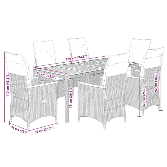 Ta vrtna jedilna garnitura je odlična izbira za večerjo na prostem ali za sprostitev na vrtu, dvorišču ali terasi. Vzdržljiv material: PE ratan, znan tudi kot poli ratan, je močan sintetični material, ki zahteva malo vzdrževanja in je videti kot naravni ratan. Je lahek, enostaven za čiščenje in se zaradi svoje vzdržljivosti in odpornosti na vremenske vplive pogosto uporablja za zunanje pohištvo.Nastavljivo naslonjalo: Ta vrtni sedež ima ročaj. S potegom ročaja lahko naslonjalo nastavite v poljuben položaj in ga hitro vrnete v prvotni položaj.Stabilna mizna plošča, ki je enostavna za čiščenje: Ta vrtna miza ima ploščo iz akacijevega lesa, ki je čvrsta, vzdržljiva in jo je enostavno čistiti z vlažno krpo.Udobno sedenje: Ta zunanja garnitura z debelo podloženimi blazinami zagotavlja udobno sedenje.Prevleko je mogoče odstraniti in oprati: Te sedežne blazine imajo odstranljive prevleke za lažje pranje in vzdrževanje. Hrbtne blazine imajo na zadnji strani zavihek za enostavno pritrditev na naslonjala. Dobro je vedeti:Če želite, da vaše zunanje pohištvo ostane lepo, vam priporočamo, da ga zaščitite z vodoodporno prevleko.UV-odpornoPotrebno sestavljanje: DaStol z naslonjalom:Barva: ČrnaMaterial: PE ratan, prašno premazano jeklo, trden akacijev les z oljnim premazomDimenzije v sedečem položaju: 56 x 59 x 92 cm (Š x G x V)Dimenzije v ležečem položaju: 56 x 83 x 85 cm (Š x G x V)Velikost sedišča: 49 x 50,5 cm (Š × G)Višina sedeža od tal: 44 cmVišina naslonjala za roke, merjena od tal: 63 cmMaksimalna nosilnost (na sedež): 110 kgMiza:Barva: ČrnaMaterial: PE ratan, jeklo, trden akacijev les z oljnim premazomDimenzije: 190 x 90 x 75 cm (D x Š x V)Blazina:Barva: Kremno belaMaterial prevleke: Tkanina (100 % poliester)Polnilo sedežne blazine: PenaPolnilo hrbtne blazine: bombažna vlaknaDimenzije sedežne blazine: 48 x 50 x 3 cm (Š x G x D)Dimenzije hrbtne blazine: 70 x 48 x 10 cm (D x Š x D)Paket vsebuje:6 x Vrtni stol s funkcijo nagiba1 x Vrtna miza6 x Sedežna blazina s snemljivo pralno prevleko6 x Blazina za hrbet 3276837
