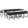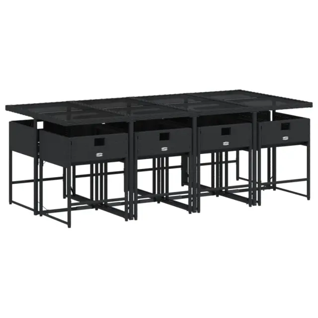 Ta vrtna jedilna garnitura je odlična izbira za večerjo na prostem ali za sprostitev na vrtu, dvorišču ali terasi. Vzdržljiv material: PE ratan, znan tudi kot poli ratan, je močan sintetični material, ki zahteva malo vzdrževanja in je videti kot naravni ratan. Je lahek, enostaven za čiščenje in se zaradi svoje vzdržljivosti in odpornosti na vremenske vplive pogosto uporablja za zunanje pohištvo.Kompaktno shranjevanje: Te stole je mogoče zložiti, zato jih je enostavno shraniti pod mizo. Ko so zloženi, se lepo prilegajo pod mizo in tvorijo prostorsko varčno kocko.Udobno sedenje: To zunanje pohištvo z debelo oblazinjenimi blazinami zagotavlja udobno sedenje.Prevleko je mogoče odstraniti in oprati: Te sedežne blazine imajo odstranljive prevleke za lažje pranje in vzdrževanje. Prevleke za blazine imajo na zadnji strani zavihek za enostavno pritrditev na naslonjala.Steklena mizna plošča: Površina zunanje mize je izdelana iz močnega in trpežnega kaljenega stekla, kar omogoča enostavno čiščenje z vlažno krpo in vašemu zunanjemu prostoru doda pridih elegance. Dobro je vedeti:Če želite, da vaše zunanje pohištvo ostane lepo, vam priporočamo, da ga zaščitite z vodoodporno prevleko.Maksimalna nosilnost (na sedež): 110 kgUV-odpornoPotrebno sestavljanje: DaMiza:Barva mizice: ČrnaBarva stekla: ČrnaMaterial: PE ratan, jeklo s prašnim premazom, kaljeno stekloDimenzije: 220 x 106 x 73 cm (D x Š x V)Stol:Barva: ČrnaMaterial: PE ratan, jeklen okvir s prašnim premazomDimenzije: 50,5 x 50 x 79 cm (Š x G x V)Velikost sedišča: 45,5 x 38 cm (Š x G)Višina sedišča, merjena od tal: 43 cmVišina naslonjal za roke, merjena od tal: 63,5 cmBlazina:Barva: Kremno belaMaterial prevleke: Tkanina (100 % poliester)Material polnila: PenaDimenzije blazine za stol: 76 x 45,5 x 2 cm (D x Š x D)Paket vsebuje:1 x Vrtna miza8 x Vrtni stol8 x Blazina za stol z visokim naslonom s snemljivo in pralno prevleko 3278045