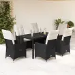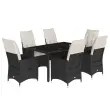 Ta vrtna jedilna garnitura je odlična izbira za večerjo na prostem ali za sprostitev na vrtu, dvorišču ali terasi. Vzdržljiv material: PE ratan, znan tudi kot poli ratan, je močan sintetični material, ki zahteva malo vzdrževanja in je videti kot naravni ratan. Je lahek, enostaven za čiščenje in se zaradi svoje vzdržljivosti in odpornosti na vremenske vplive pogosto uporablja za zunanje pohištvo.Nastavljivo naslonjalo: Ta vrtni sedež ima ročaj. S potegom ročaja lahko naslonjalo nastavite v poljuben položaj in ga hitro vrnete v prvotni položaj.Steklena mizna plošča: Površina zunanje mize je izdelana iz močnega in trpežnega kaljenega stekla, kar omogoča enostavno čiščenje z vlažno krpo in vašemu zunanjemu prostoru doda pridih elegance.Udobno sedenje: Ta zunanja garnitura z debelo podloženimi blazinami zagotavlja udobno sedenje.Prevleko je mogoče odstraniti in oprati: Te sedežne blazine imajo odstranljive prevleke za lažje pranje in vzdrževanje. Hrbtne blazine imajo na zadnji strani zavihek za enostavno pritrditev na naslonjala. Dobro je vedeti:Če želite, da vaše zunanje pohištvo ostane lepo, vam priporočamo, da ga zaščitite z vodoodporno prevleko.UV-odpornoPotrebno sestavljanje: DaStol z naslonjalom:Barva: ČrnaMaterial: PE ratan, jeklen okvir s prašnim premazomDimenzije v sedečem položaju: 56 x 59 x 92 cm (Š x G x V)Dimenzije v ležečem položaju: 56 x 83 x 85 cm (Š x G x V)Velikost sedišča: 49 x 50,5 cm (Š × G)Višina sedeža od tal: 44 cmVišina naslonjala za roke, merjena od tal: 63 cmMaksimalna nosilnost (na sedež): 110 kgNastavljiv stol z oporo za noge:Barva: ČrnaMaterial: PE ratan, jeklen okvir s prašnim premazomDimenzije v sedečem položaju: 56 x 59 x 92 cm (Š x G x V)Dimenzije v ležečem položaju: 56 x 83 x 85 cm (Š x G x V)Velikost sedišča: 49 x 50,5 cm (Š × G)Višina sedeža od tal: 44 cmVišina naslonjala za roke, merjena od tal: 63 cmMaksimalna nosilnost (na sedež): 110 kgMiza:Barva: ČrnaMaterial: PE ratan, jeklo, kaljeno stekloDimenzije: 150 x 90 x 75 cm (D x Š x V)Blazina:Barva: Kremno belaMaterial prevleke: Tkanina (100 % poliester)Polnilo sedežne blazine: PenaPolnilo hrbtne blazine: bombažna vlaknaDimenzije sedežne blazine: 48 x 50/90 x 3 cm (Š x G x D)Dimenzije hrbtne blazine: 70 x 48 x 10 cm (D x Š x D)Paket vsebuje:4 x Vrtni stol s funkcijo nagiba2 x Vrtni stol z oporo za noge1 x Vrtna miza6 x Sedežna blazina s snemljivo pralno prevleko6 x Blazina za hrbet 3276696