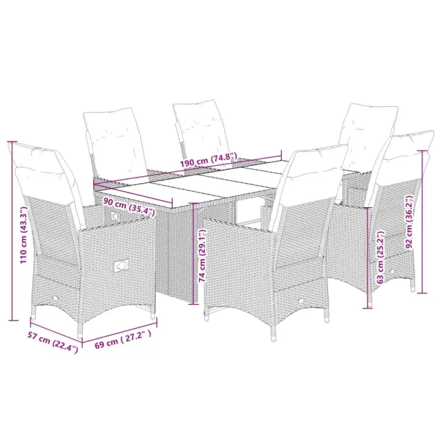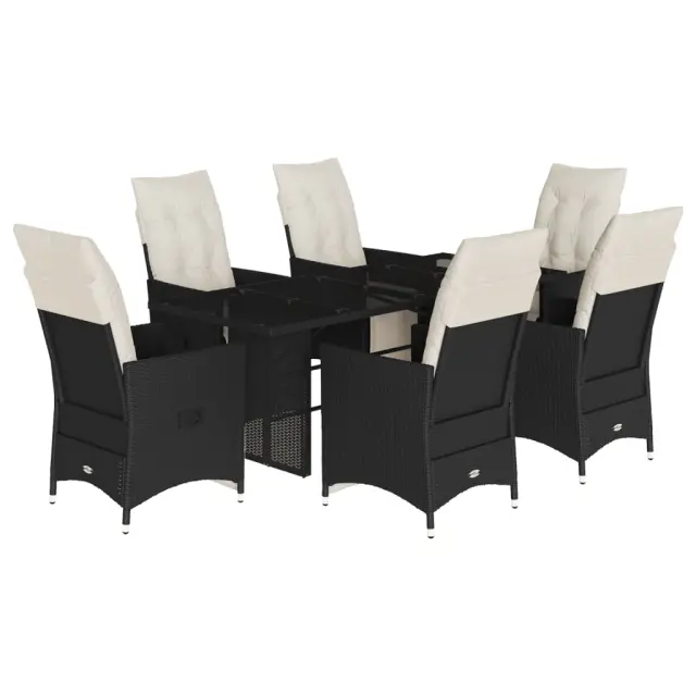 Ta vrtna jedilna garnitura je odlična izbira za večerjo na prostem ali za sprostitev na vrtu, dvorišču ali terasi. Vzdržljiv material: PE ratan, znan tudi kot poli ratan, je močan sintetični material, ki zahteva malo vzdrževanja in je videti kot naravni ratan. Je lahek, enostaven za čiščenje in se zaradi svoje vzdržljivosti in odpornosti na vremenske vplive pogosto uporablja za zunanje pohištvo.Nastavljivo naslonjalo za hrbet in podnožje: Ta vrtni sedež ima ročaj. Naslonjalo za hrbet in naslonjalo za noge lahko s potegom ročaja nastavite v poljuben položaj in ju hitro vrnete v prvotni položaj.Steklena mizna plošča: Površina zunanje mize je izdelana iz močnega in trpežnega kaljenega stekla, kar omogoča enostavno čiščenje z vlažno krpo in vašemu zunanjemu prostoru doda pridih elegance.Udobno sedenje: Ta zunanja garnitura z debelo podloženimi blazinami zagotavlja udobno sedenje.Prevleko je mogoče odstraniti in oprati: Te sedežne blazine imajo odstranljive prevleke za lažje pranje in vzdrževanje. Hrbtne blazine imajo na zadnji strani zavihek za enostavno pritrditev na naslonjala. Dobro je vedeti:Če želite, da vaše zunanje pohištvo ostane lepo, vam priporočamo, da ga zaščitite z vodoodporno prevleko.UV-odpornoPotrebno sestavljanje: DaNastavljiv stol z oporo za noge:Barva: ČrnaMaterial: PE ratan, jeklen okvir s prašnim premazomDimenzije v sedečem položaju: 56 x 59 x 92 cm (Š x G x V)Dimenzije v ležečem položaju: 56 x 83 x 85 cm (Š x G x V)Velikost sedišča: 49 x 50,5 cm (Š × G)Višina sedeža od tal: 44 cmVišina naslonjala za roke, merjena od tal: 63 cmMaksimalna nosilnost (na sedež): 110 kgMiza:Barva: ČrnaMaterial: PE ratan, jeklo s prašnim premazom, kaljeno stekloDimenzije: 190 x 80 x 75 cm (D x Š x V)Blazina:Barva: Kremno belaMaterial prevleke: Tkanina (100 % poliester)Polnilo sedežne blazine: PenaPolnilo hrbtne blazine: bombažna vlaknaDimenzije sedežne blazine: 48 x 90 x 3 cm (Š x G x D)Dimenzije hrbtne blazine: 70 x 48 x 10 cm (D x Š x D)Paket vsebuje:6 x Vrtni stol z oporo za noge1 x Vrtna miza6 x Sedežna blazina s snemljivo pralno prevleko6 x Blazina za hrbet 3276869