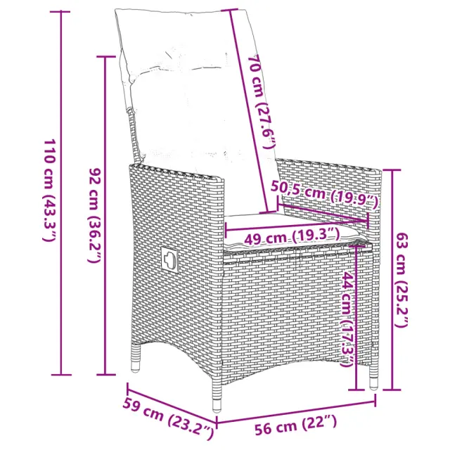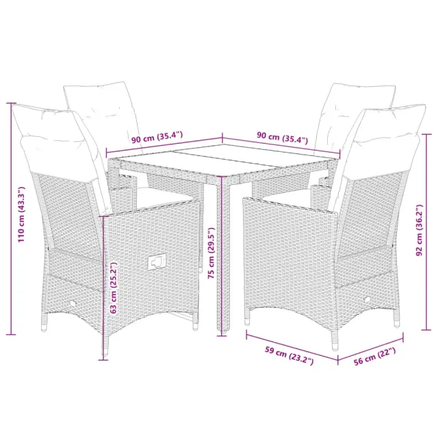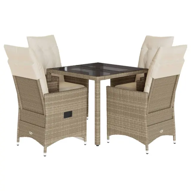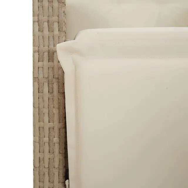 Ta vrtna jedilna garnitura je odlična izbira za večerjo na prostem ali za sprostitev na vrtu, dvorišču ali terasi. Vzdržljiv material: PE ratan, znan tudi kot poli ratan, je močan sintetični material, ki zahteva malo vzdrževanja in je videti kot naravni ratan. Je lahek, enostaven za čiščenje in se zaradi svoje vzdržljivosti in odpornosti na vremenske vplive pogosto uporablja za zunanje pohištvo.Nastavljivo naslonjalo za hrbet in podnožje: Ta vrtni sedež ima ročaj. Naslonjalo za hrbet in naslonjalo za noge lahko s potegom ročaja nastavite v poljuben položaj in ju hitro vrnete v prvotni položaj.Praktična mizna plošča: Površina iz kaljenega stekla je popolna za odlaganje ali razstavljanje različnih potrebščin. Je tudi preprosta za čiščenje in vzdrževanje.Udobno sedenje: Ta zunanja garnitura z debelo podloženimi blazinami zagotavlja udobno sedenje.Prevleko je mogoče odstraniti in oprati: Te sedežne blazine imajo odstranljive prevleke za lažje pranje in vzdrževanje. Hrbtne blazine imajo na zadnji strani zavihek za enostavno pritrditev na naslonjala. Dobro je vedeti:Če želite, da vaše zunanje pohištvo ostane lepo, vam priporočamo, da ga zaščitite z vodoodporno prevleko.UV-odpornoPotrebno sestavljanje: DaStol z naslonjalom:Barva: BežMaterial: PE ratan, jeklen okvir s prašnim premazomDimenzije v sedečem položaju: 56 x 59 x 92 cm (Š x G x V)Dimenzije v ležečem položaju: 56 x 83 x 85 cm (Š x G x V)Velikost sedišča: 49 x 50,5 cm (Š × G)Višina sedeža od tal: 44 cmVišina naslonjala za roke, merjena od tal: 63 cmMaksimalna nosilnost (na sedež): 110 kgNastavljiv stol z oporo za noge:Barva: BežMaterial: PE ratan, jeklen okvir s prašnim premazomDimenzije v sedečem položaju: 56 x 59 x 92 cm (Š x G x V)Dimenzije v ležečem položaju: 56 x 83 x 85 cm (Š x G x V)Velikost sedišča: 49 x 50,5 cm (Š × G)Višina sedeža od tal: 44 cmVišina naslonjala za roke, merjena od tal: 63 cmMaksimalna nosilnost (na sedež): 110 kgMiza:Barva: BežMaterial: PE ratan, jeklo, kaljeno stekloDimenzije: 90 x 90 x 75 cm (D x Š x V)Blazina:Barva: Kremno belaMaterial prevleke: Tkanina (100 % poliester)Polnilo sedežne blazine: PenaPolnilo hrbtne blazine: bombažna vlaknaDimenzije sedežne blazine: 48 x 50/90 x 3 cm (Š x G x D)Dimenzije hrbtne blazine: 70 x 48 x 10 cm (D x Š x D)Paket vsebuje:2 x Vrtni stol s funkcijo nagiba2 x Vrtni stol z oporo za noge1 x Vrtna miza4 x Sedežna blazina s snemljivo in pralno prevleko4 x Blazina za hrbet 3276801