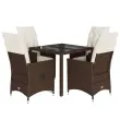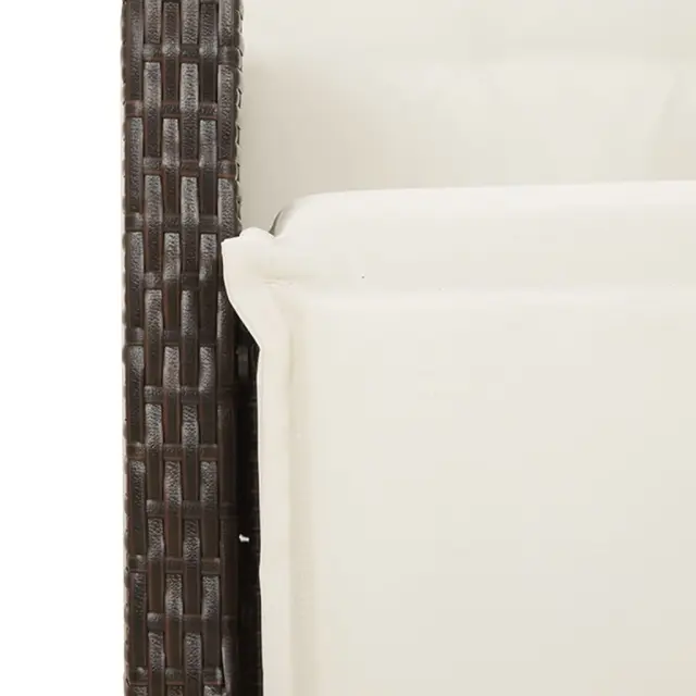 Ta vrtna jedilna garnitura je odlična izbira za večerjo na prostem ali za sprostitev na vrtu, dvorišču ali terasi. Vzdržljiv material: PE ratan, znan tudi kot poli ratan, je močan sintetični material, ki zahteva malo vzdrževanja in je videti kot naravni ratan. Je lahek, enostaven za čiščenje in se zaradi svoje vzdržljivosti in odpornosti na vremenske vplive pogosto uporablja za zunanje pohištvo.Nastavljivo naslonjalo: Ta vrtni sedež ima ročaj. S potegom ročaja lahko naslonjalo nastavite v poljuben položaj in ga hitro vrnete v prvotni položaj.Steklena mizna plošča: Površina zunanje mize je izdelana iz močnega in trpežnega kaljenega stekla, kar omogoča enostavno čiščenje z vlažno krpo in vašemu zunanjemu prostoru doda pridih elegance.Udobno sedenje: Ta zunanja garnitura z debelo podloženimi blazinami zagotavlja udobno sedenje.Prevleko je mogoče odstraniti in oprati: Te sedežne blazine imajo odstranljive prevleke za lažje pranje in vzdrževanje. Hrbtne blazine imajo na zadnji strani zavihek za enostavno pritrditev na naslonjala. Dobro je vedeti:Če želite, da vaše zunanje pohištvo ostane lepo, vam priporočamo, da ga zaščitite z vodoodporno prevleko.UV-odpornoPotrebno sestavljanje: DaStol z naslonjalom:Barva: RjavaMaterial: PE ratan, jeklen okvir s prašnim premazomDimenzije v sedečem položaju: 56 x 59 x 92 cm (Š x G x V)Dimenzije v ležečem položaju: 56 x 83 x 85 cm (Š x G x V)Velikost sedišča: 49 x 50,5 cm (Š × G)Višina sedeža od tal: 44 cmVišina naslonjala za roke, merjena od tal: 63 cmMaksimalna nosilnost (na sedež): 110 kgNastavljiv stol z oporo za noge:Barva: RjavaMaterial: PE ratan, jeklen okvir s prašnim premazomDimenzije v sedečem položaju: 56 x 59 x 92 cm (Š x G x V)Dimenzije v ležečem položaju: 56 x 83 x 85 cm (Š x G x V)Velikost sedišča: 49 x 50,5 cm (Š × G)Višina sedeža od tal: 44 cmVišina naslonjala za roke, merjena od tal: 63 cmMaksimalna nosilnost (na sedež): 110 kgMiza:Barva: RjavaMaterial: PE ratan, jeklo, kaljeno stekloDimenzije: 90 x 90 x 75 cm (D x Š x V)Blazina:Barva: Kremno belaMaterial prevleke: Tkanina (100 % poliester)Polnilo sedežne blazine: PenaPolnilo hrbtne blazine: bombažna vlaknaDimenzije sedežne blazine: 48 x 50/90 x 3 cm (Š x G x D)Dimenzije hrbtne blazine: 70 x 48 x 10 cm (D x Š x D)Paket vsebuje:2 x Vrtni stol s funkcijo nagiba2 x Vrtni stol z oporo za noge1 x Vrtna miza4 x Sedežna blazina s snemljivo in pralno prevleko4 x Blazina za hrbet 3276769
